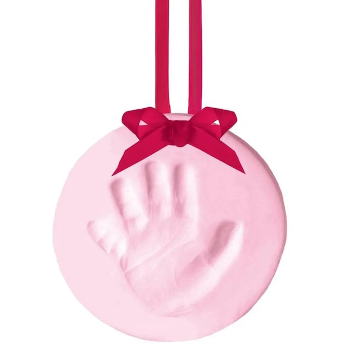 Capture and cherish your little ones prints forever with Pearhead’s babyprints keepsake. This babyprints keepsake comes with everything you need to make your little pearhead’s footprint or handprint. It includes one package of soft, pink air drying clay and a ribbon to display the keepsake once finished. The clay requires no mixing or baking! Simply knead the clay and roll it out to the size of the included shaping ring. Press baby’s hand or foot in the clay gently but hard enough to create an impression. If you make a mistake – no problem! You can redo it as many times as you need until you get the perfect impression. Once you have your print, use the shaping ring to make a circle and a hole for the ribbon. Then pull off the excess clay and let dry for 1-2 days. Use the pink ribbon as your finishing touch! Now you will always be able to remember how little your baby’s piggies were with Pearhead’s babyprints keepsake.