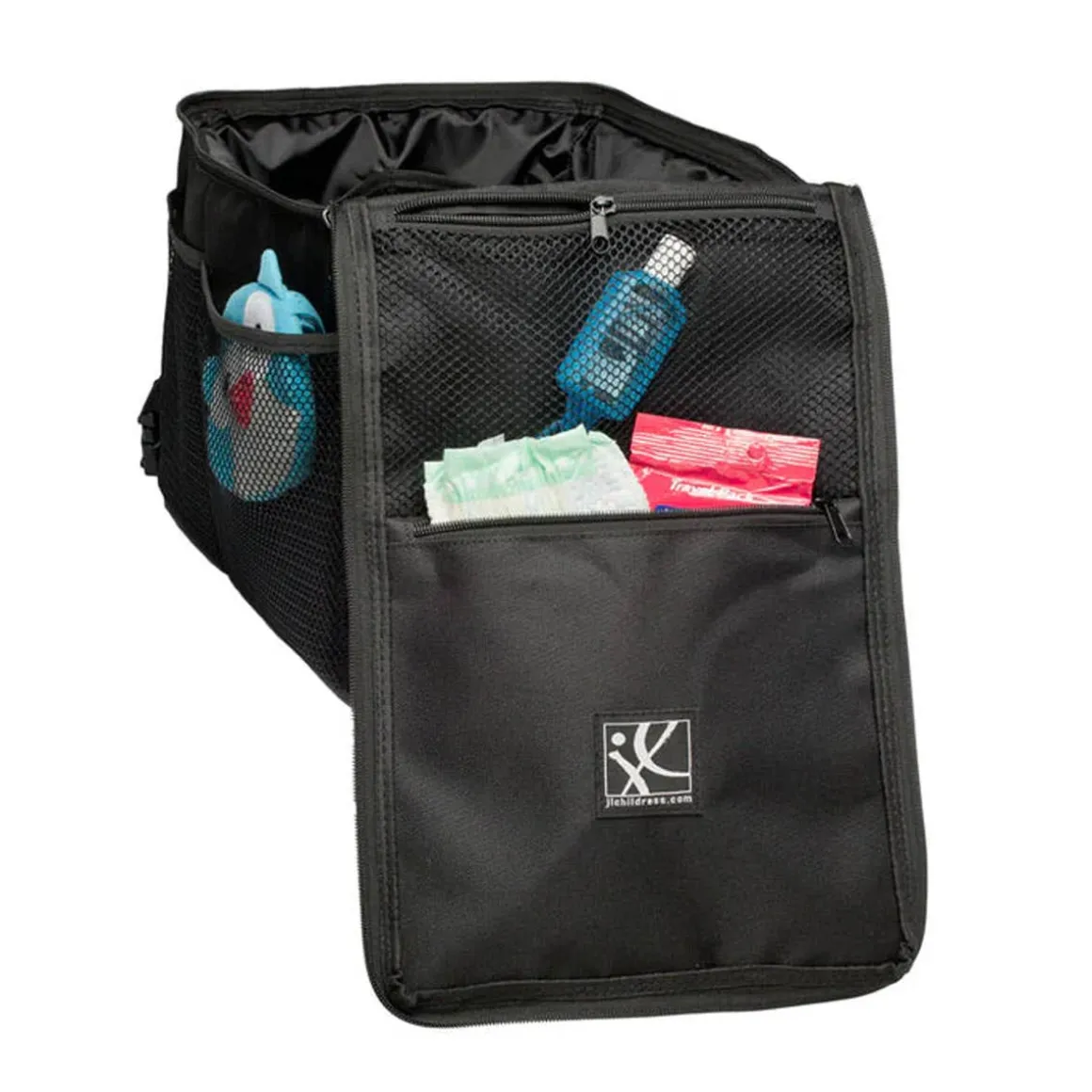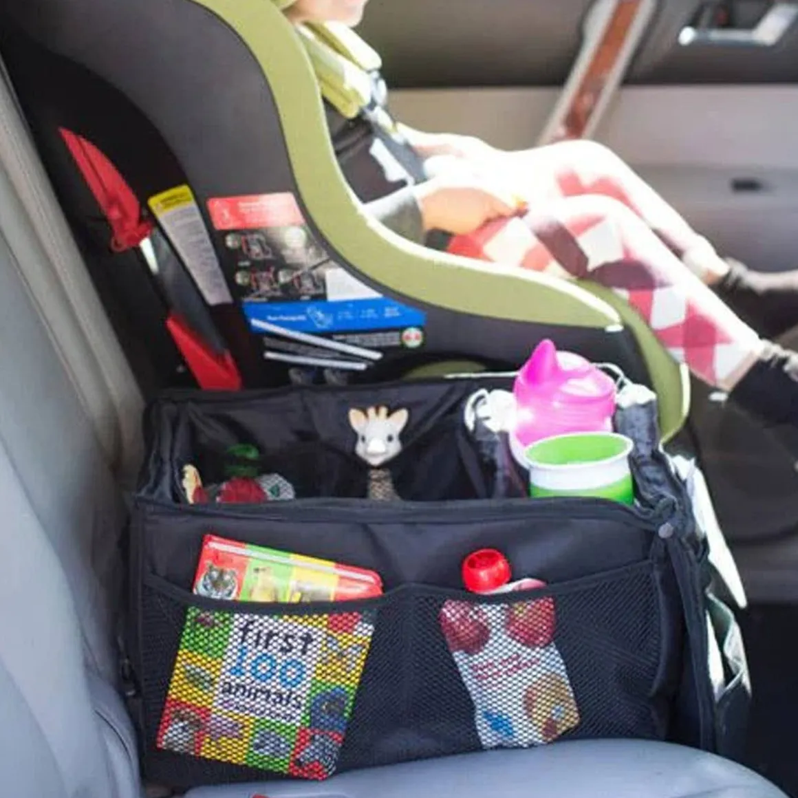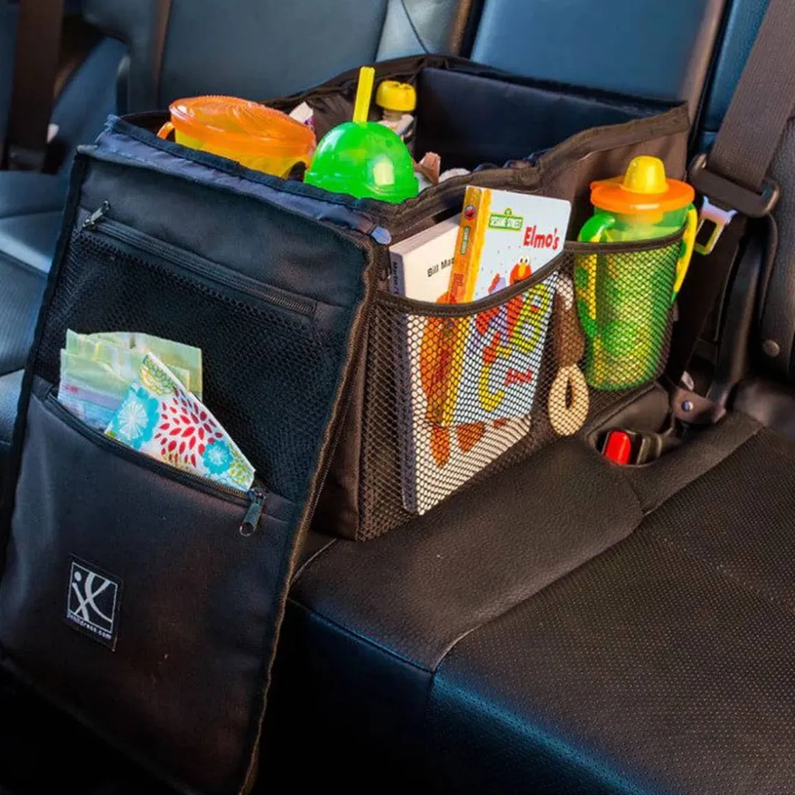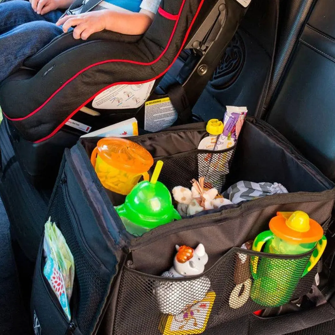 A butler for the backseat. Is the inside of your car quickly becoming a disaster? Are sippy cups, leftover snacks, toys, books and more slowly taking over?! Have no fear…the Backseat Butler Car Organizer is here! This organizer is a lifesaver for on-the-go families – from carpool to road trips – it keeps toys, snacks and drinks close at hand and gives you a place to put everything that mysteriously ends up in your car. Larger than other car organizers, the Backseat Butler features 2 cup holders PLUS 10 total pockets with an extra-large main compartment. Multiple mesh pockets make it easy to see what’s inside and zippered pockets on the top parent-facing-panel are easily accessible from even the driver’s seat. Transport between cars or house-to-car with two carry handles. An adjustable strap can be used to attach the Backseat Butler to your vehicle for safety. The Backseat Butler conveniently fits on the back seat of your car or on the floor between bucket seats. With rigid side and back panel construction, the Backseat Butler absolutely holds its shape, even when packed full of all your child’s “necessities.”