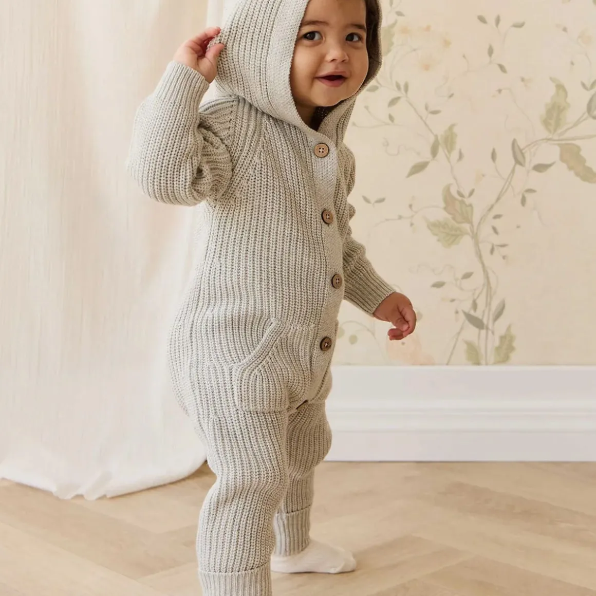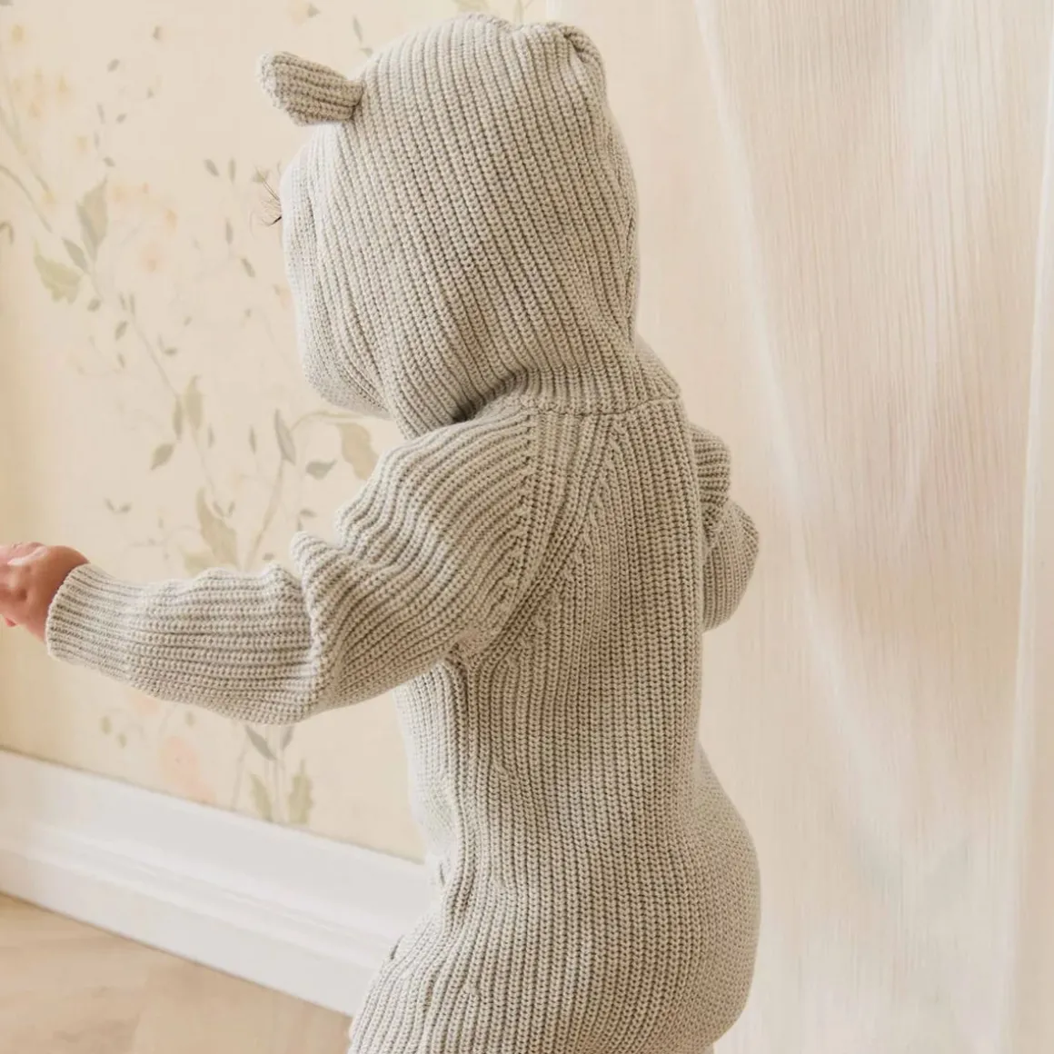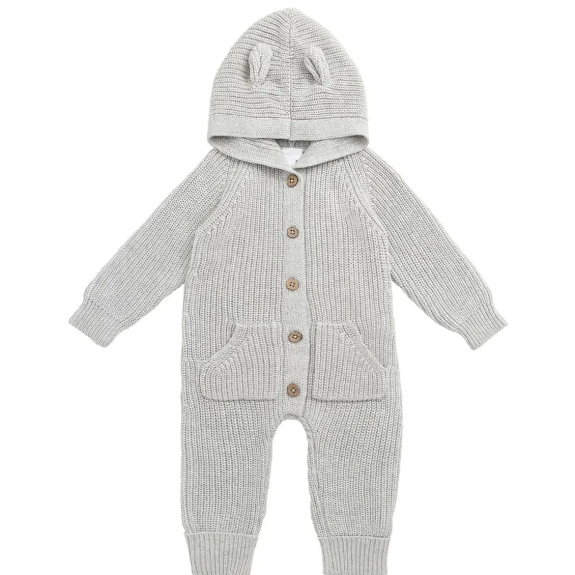 Let your little one snuggle up in the adorable Bear Knit Onepiece in Light Grey Marle. Crafted from 100% cotton, this cosy all-in-one features a soft knit texture, coconut button details, front pockets, and the sweetest bear ears on the hood. Perfect for keeping your child warm while looking irresistibly cute.