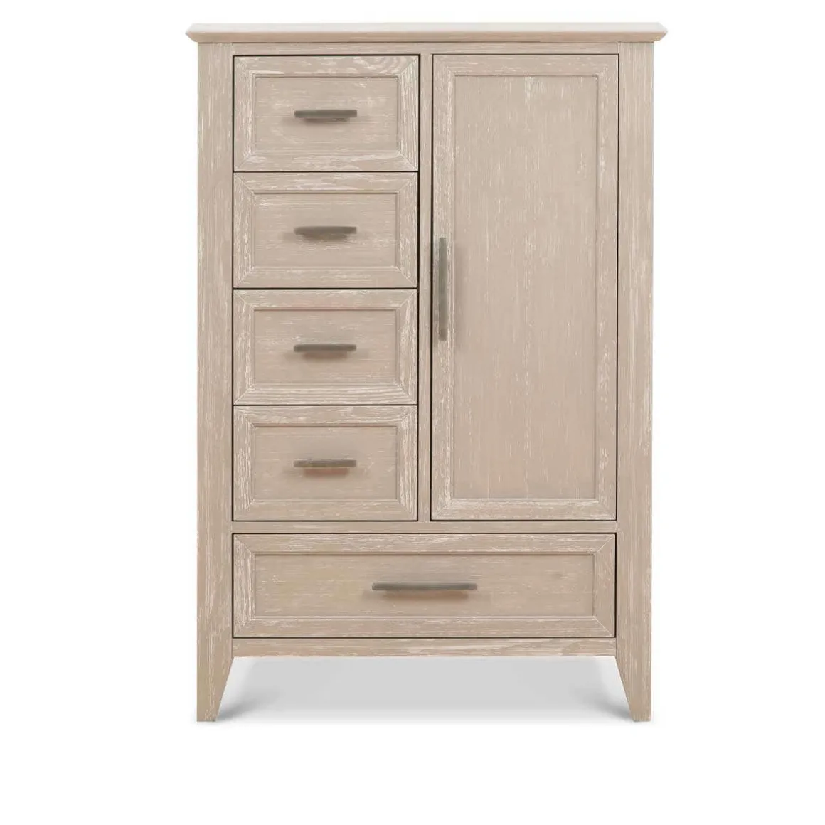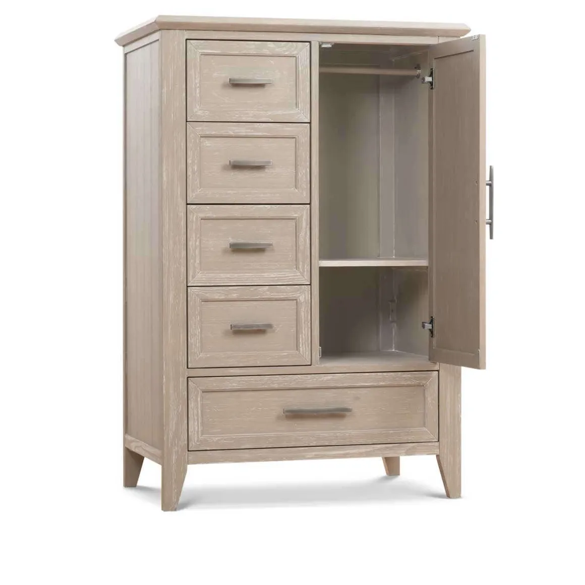 The Beckett Chifforobe bridges the gap between traditional and modern design with its texturized wood finish, clean silhouette and thoughtful detailing. Featuring drawers and cabinet space, simple tapered feet, and mitered cuts with contemporary 45 degree trimming, the Beckett Chifforobe is a transitional piece that will grow with your family.