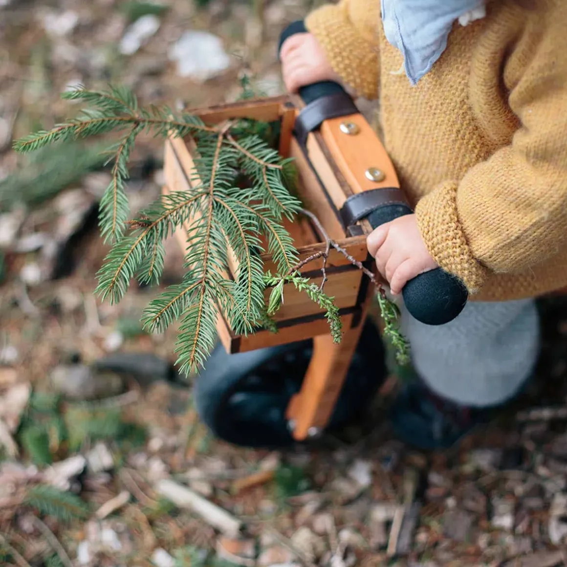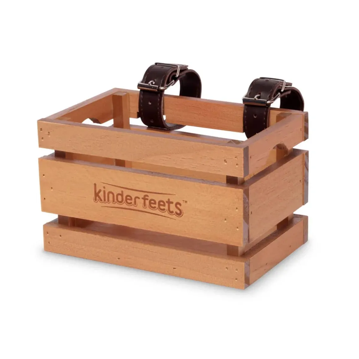 The Kinderfeets Wooden Crate fits all Kinderfeets bikes and most other brands so children can carry their toys, games, stuffed animals and newfound treasures with them wherever they go. Faux leather straps provide reliable attachment and dimensions of 7” L x 4.5” W x 4” H (16.5 x 11 x 10 cm) supply just the right amount of storage space.