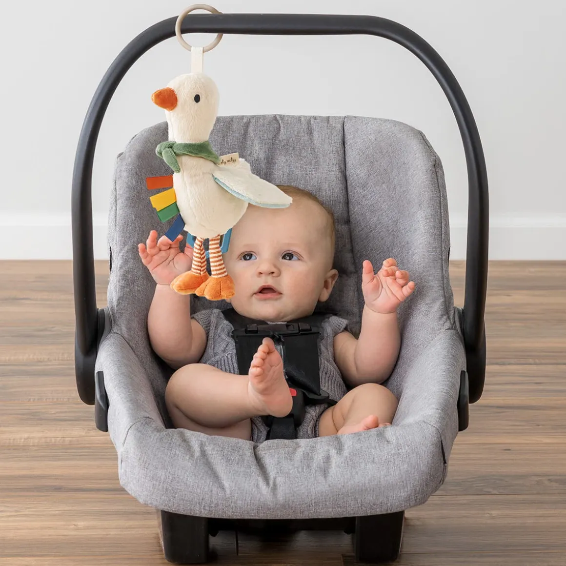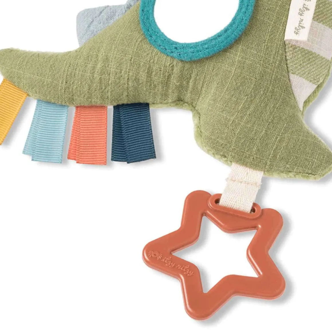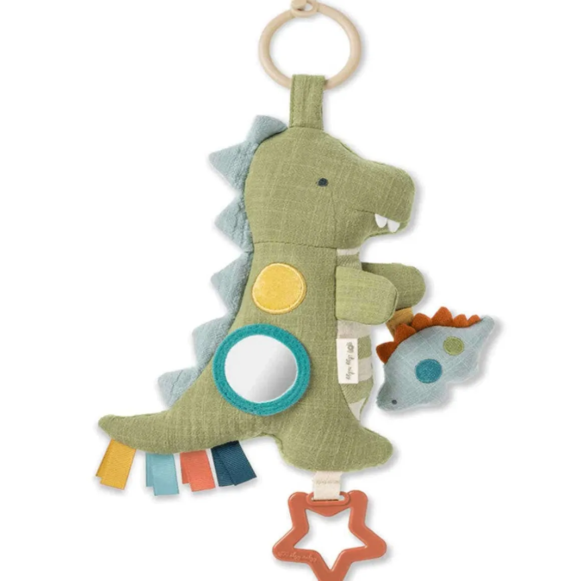 Your little one’s new exploratory tagalong! The attachable Bitzy Traveler™ is made with soft natural cotton fabric and features jingle sounds, dangling rings, crinkle textures and more! A developmental gem and loveable treasure.