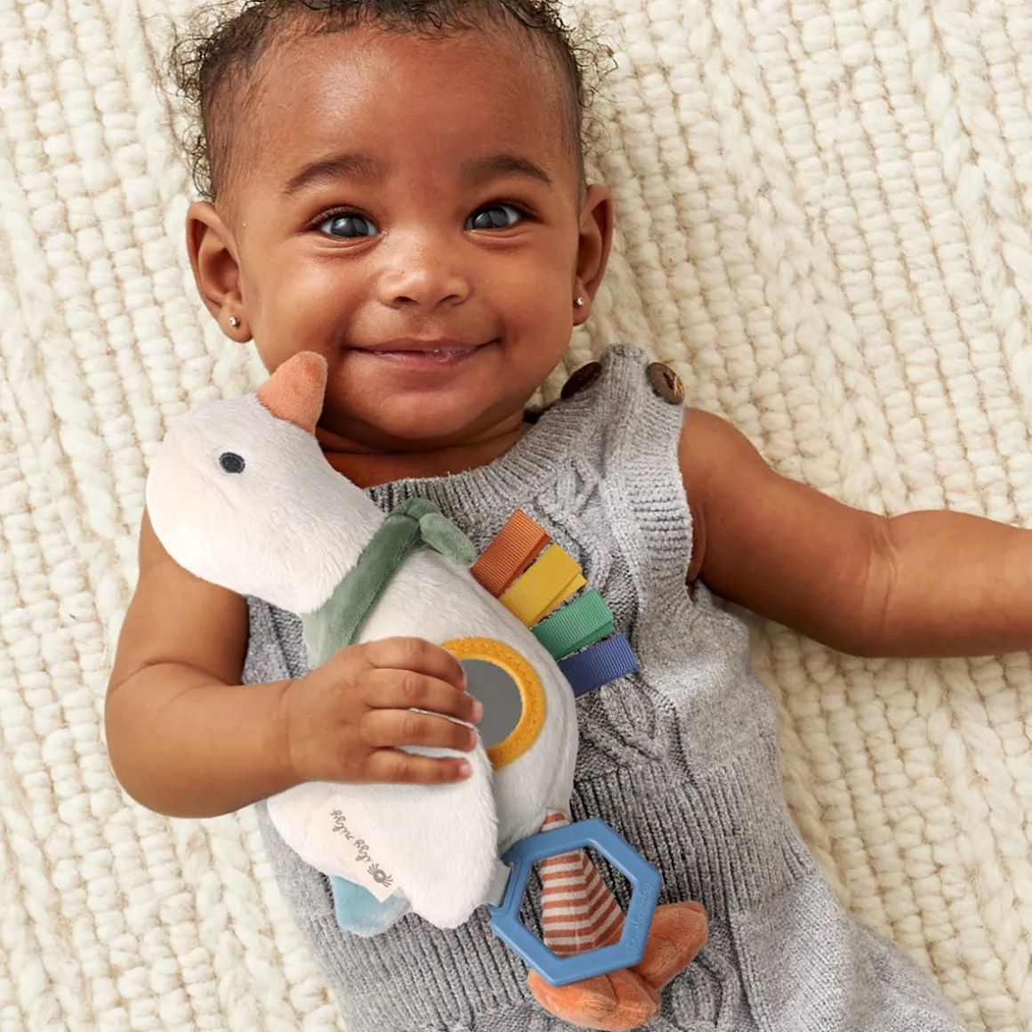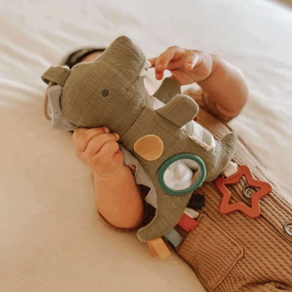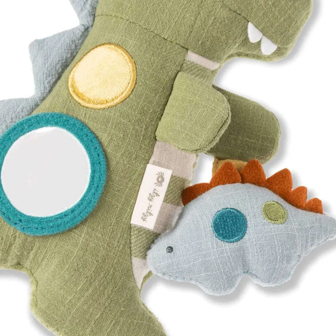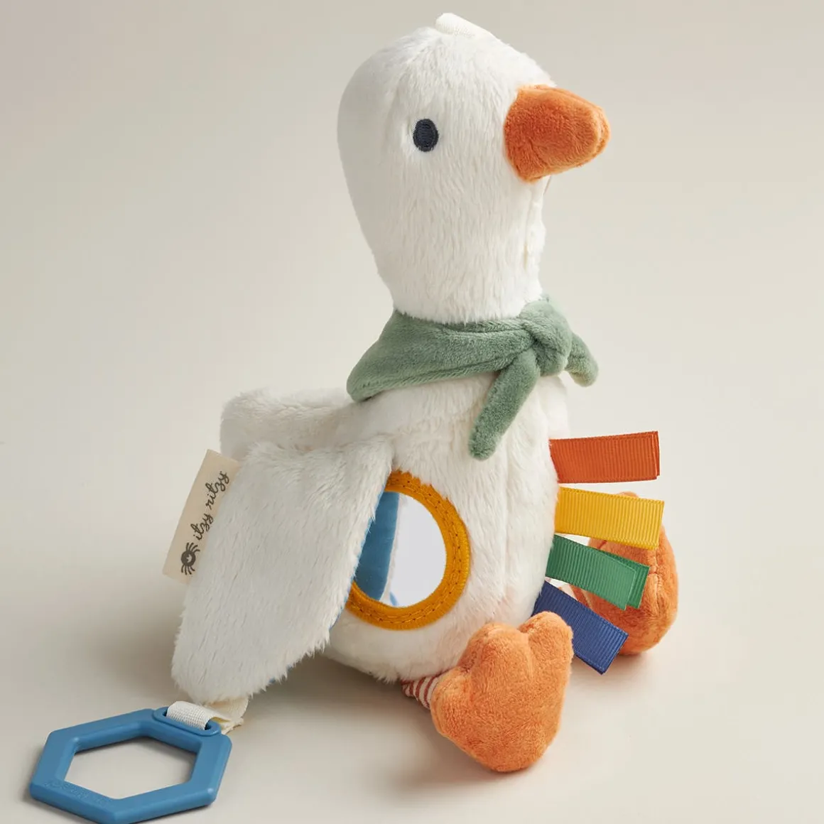 Your little one’s new exploratory tagalong! The attachable Bitzy Traveler™ is made with soft natural cotton fabric and features jingle sounds, dangling rings, crinkle textures and more! A developmental gem and loveable treasure.