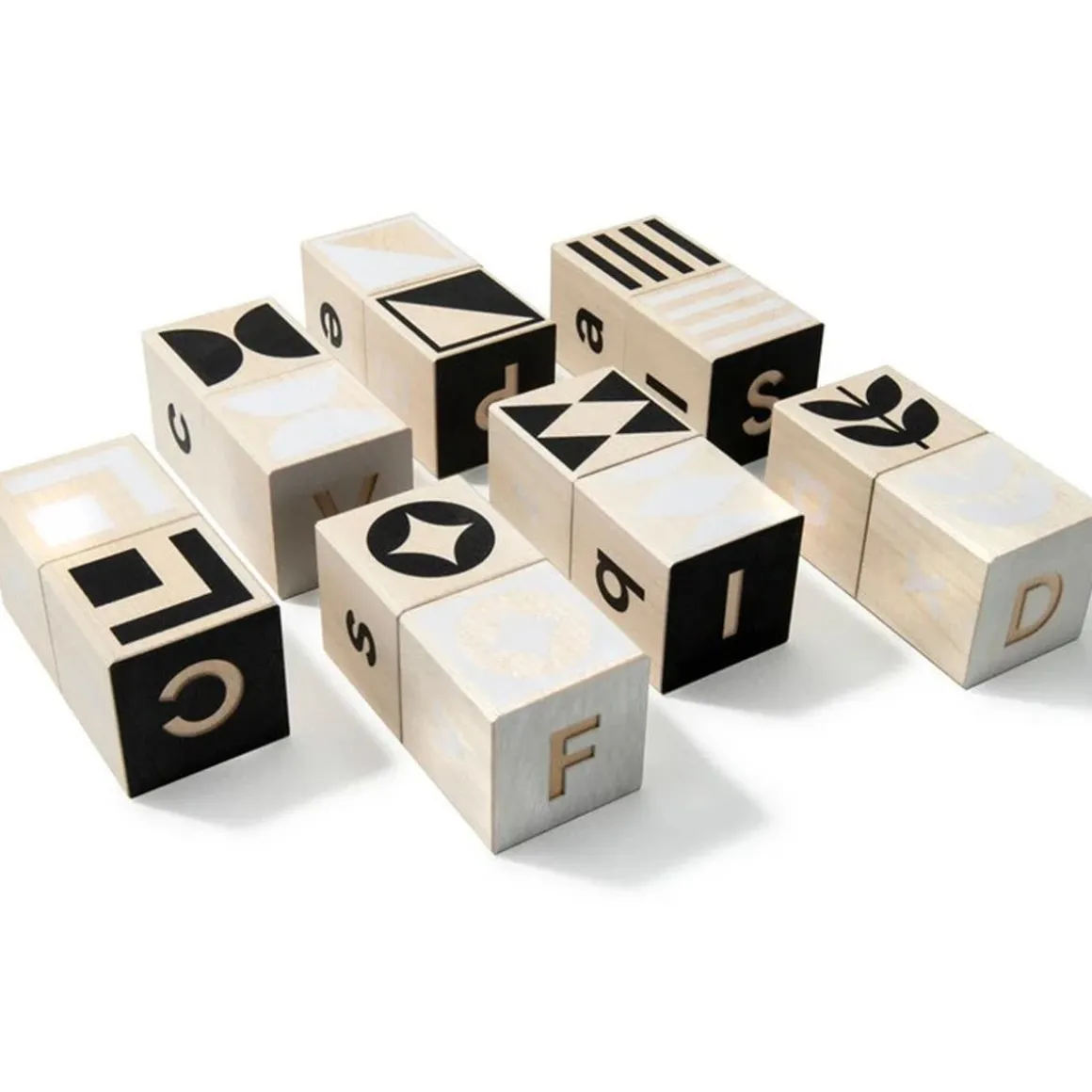 Behold 14 bold black and white blocks. Sans serif letters on black and white backgrounds. See and feel two debossed sides per block. Enjoy the geometric and floral patterns.