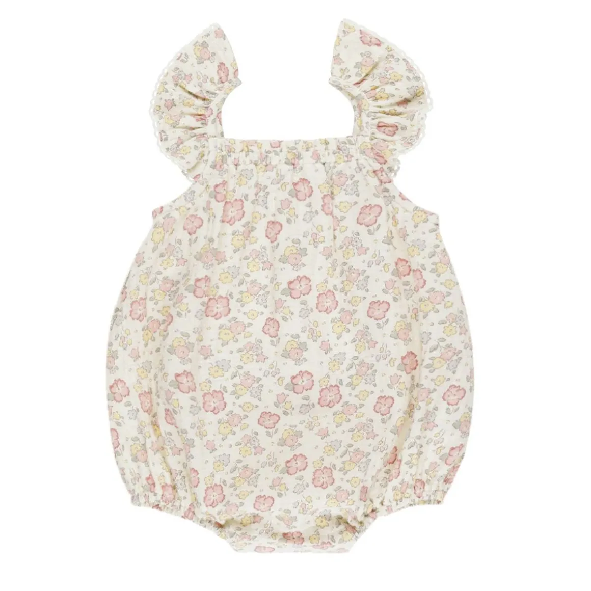 Quincy Mae Bonnie Romper features shoulder straps with ruffle detail, an elastic back neckline, elastic leg openings, and bottom snaps for easy changes.