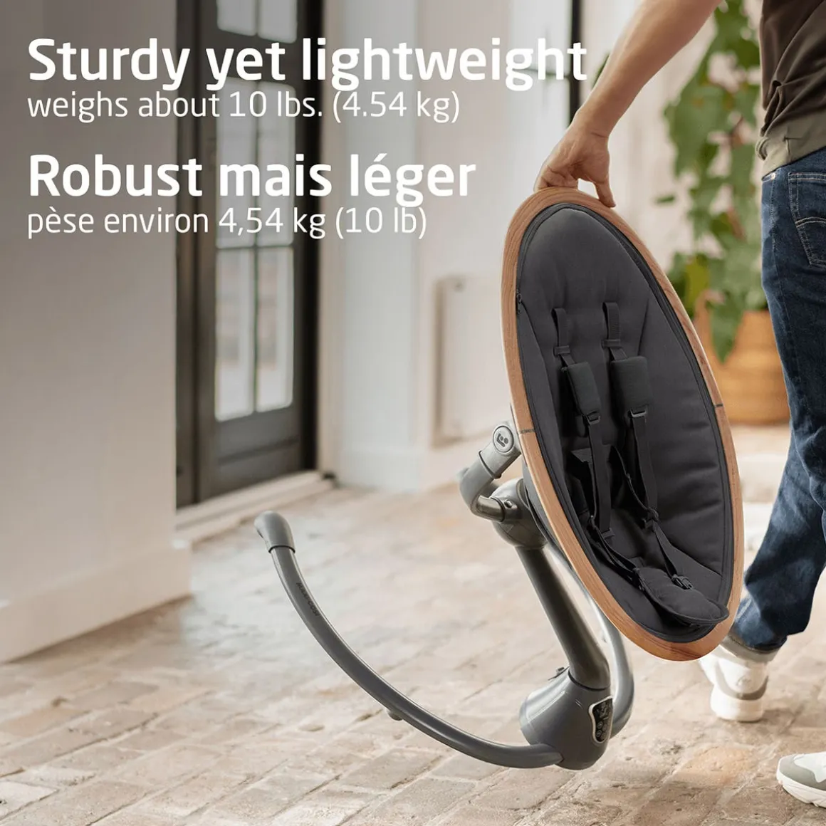 Lighter than the family cat Its 360⁰ rotation helps you maintain eye contact with your baby – because we know you can never take your eyes off of them. From the living room to the home office and back, you can easily take Cassia with you. Not only does it weigh about 10 pounds – less than the family cat – it also has a space-saving frame. And a stylish one at that.