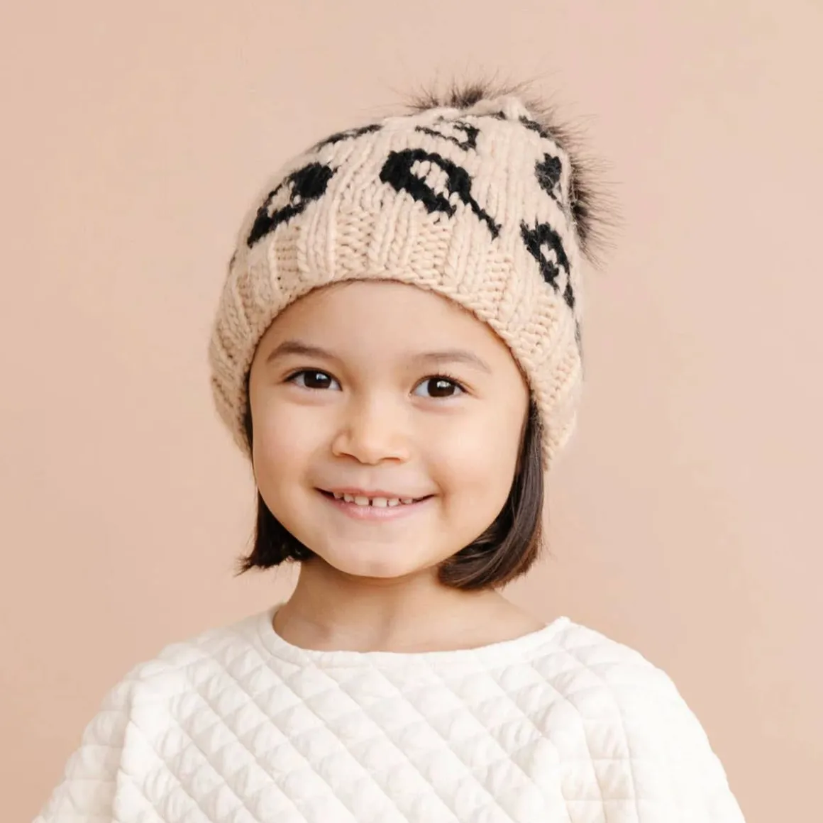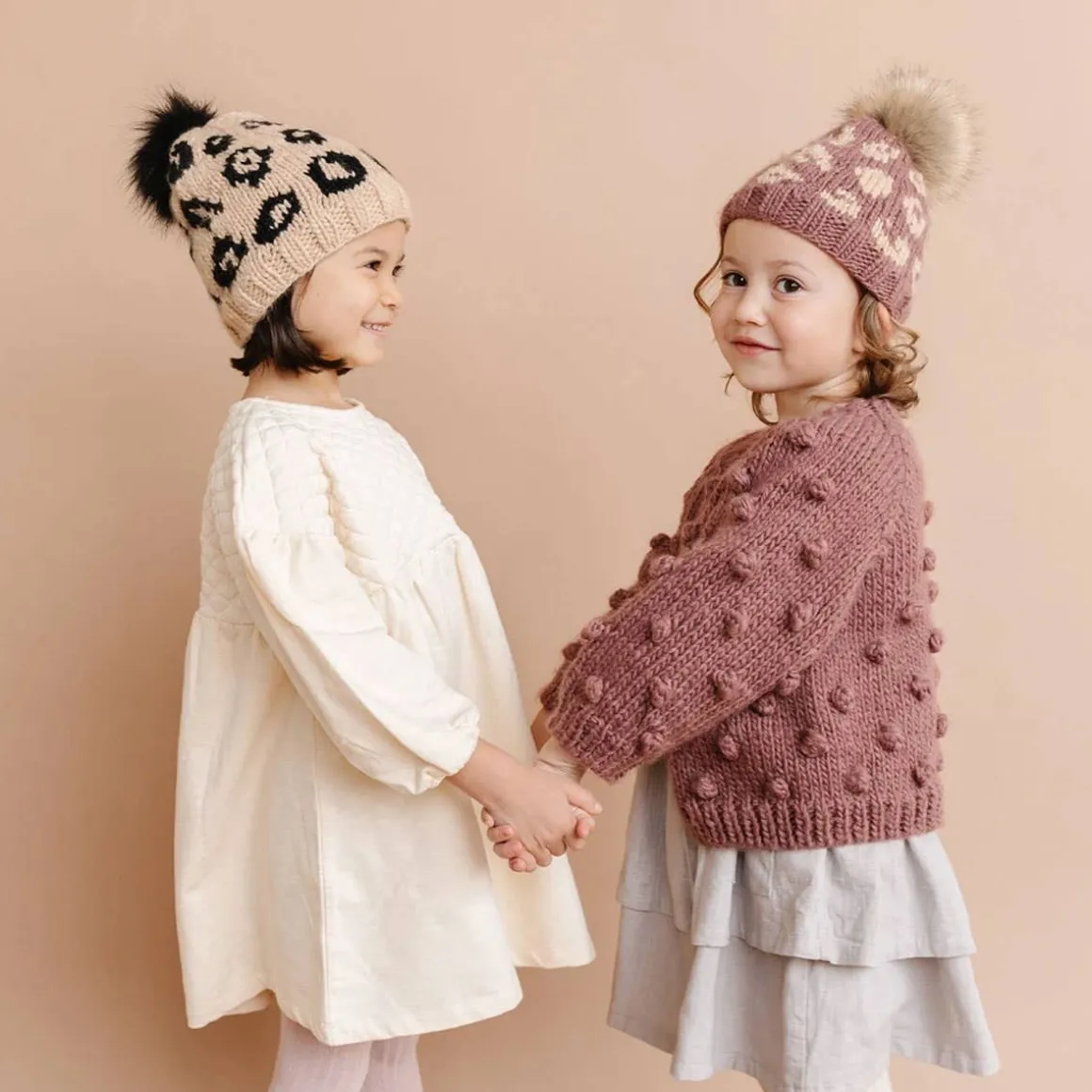 A fun cheetah print with a faux fur pom and latte spots for your sweetly fashionable little ones. Also available in Blush and latte.