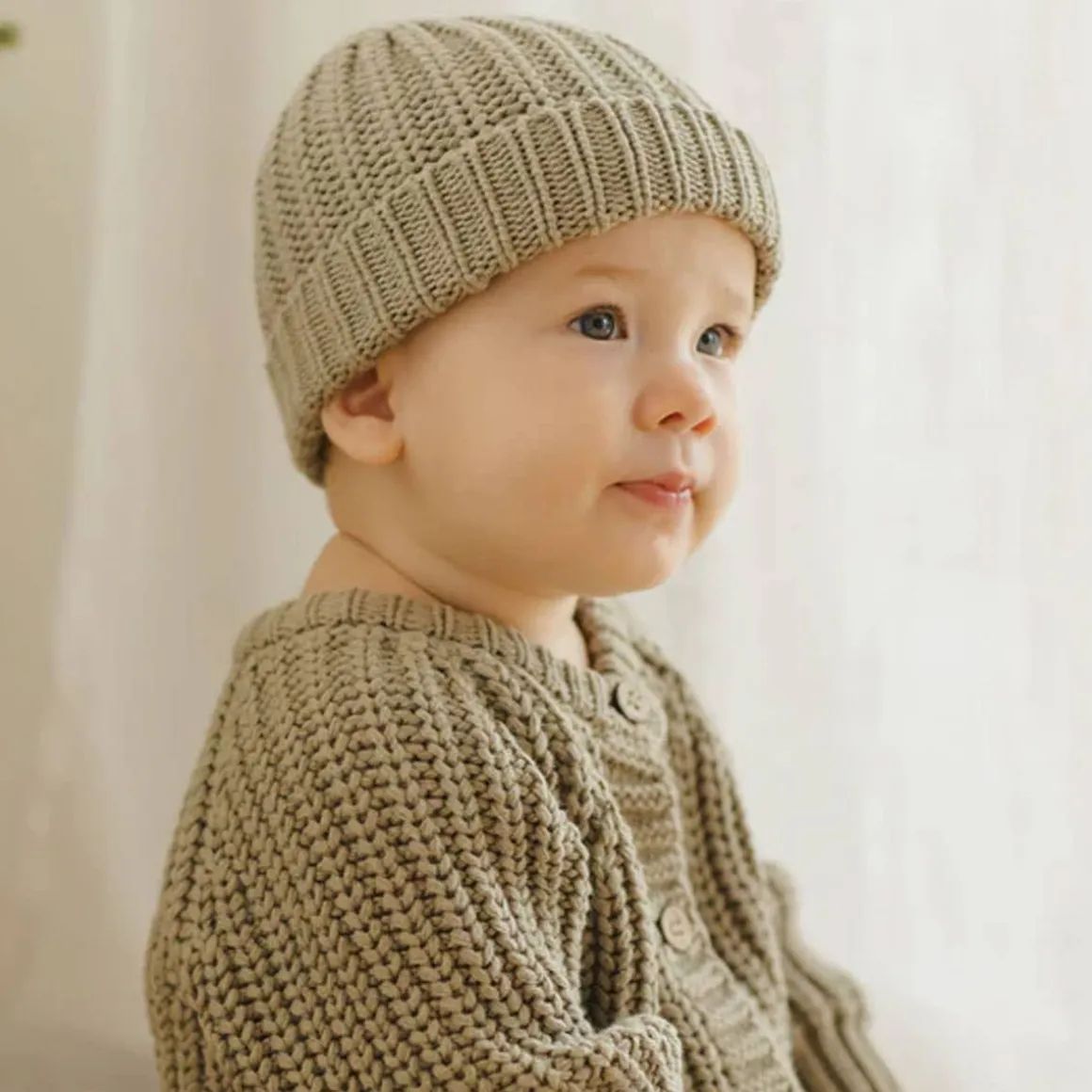 Chunky sweater knit beanie with fold-up cuff. Made of 100% Organic Cotton