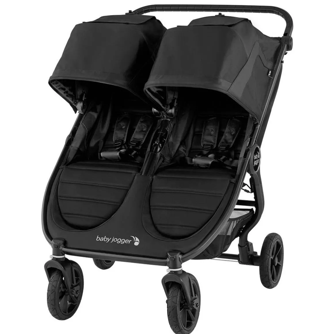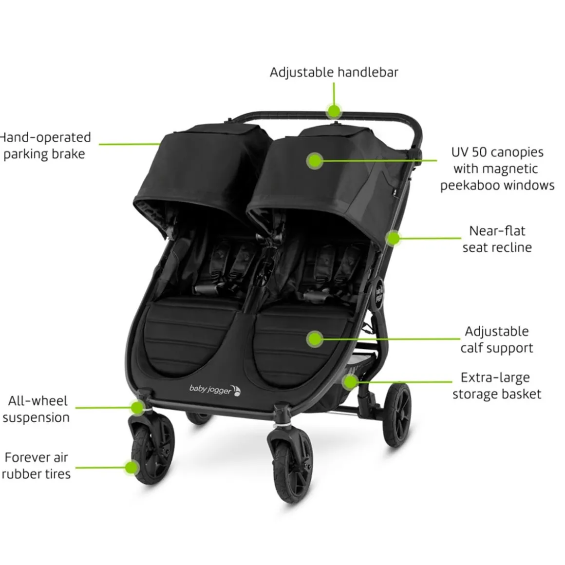The Baby Jogger® city mini® GT2 Double has an all new design with Forever Air rubber tires and all-wheel suspension providing uncompromised agility on any terrain with two. The signature in-seat fold, adjustable handlebar, and hand-operated parking brake provide you the ultimate convenience while the adjustable calf supports and near-flat seat reclines allow you to find the most comfortable position for your children.