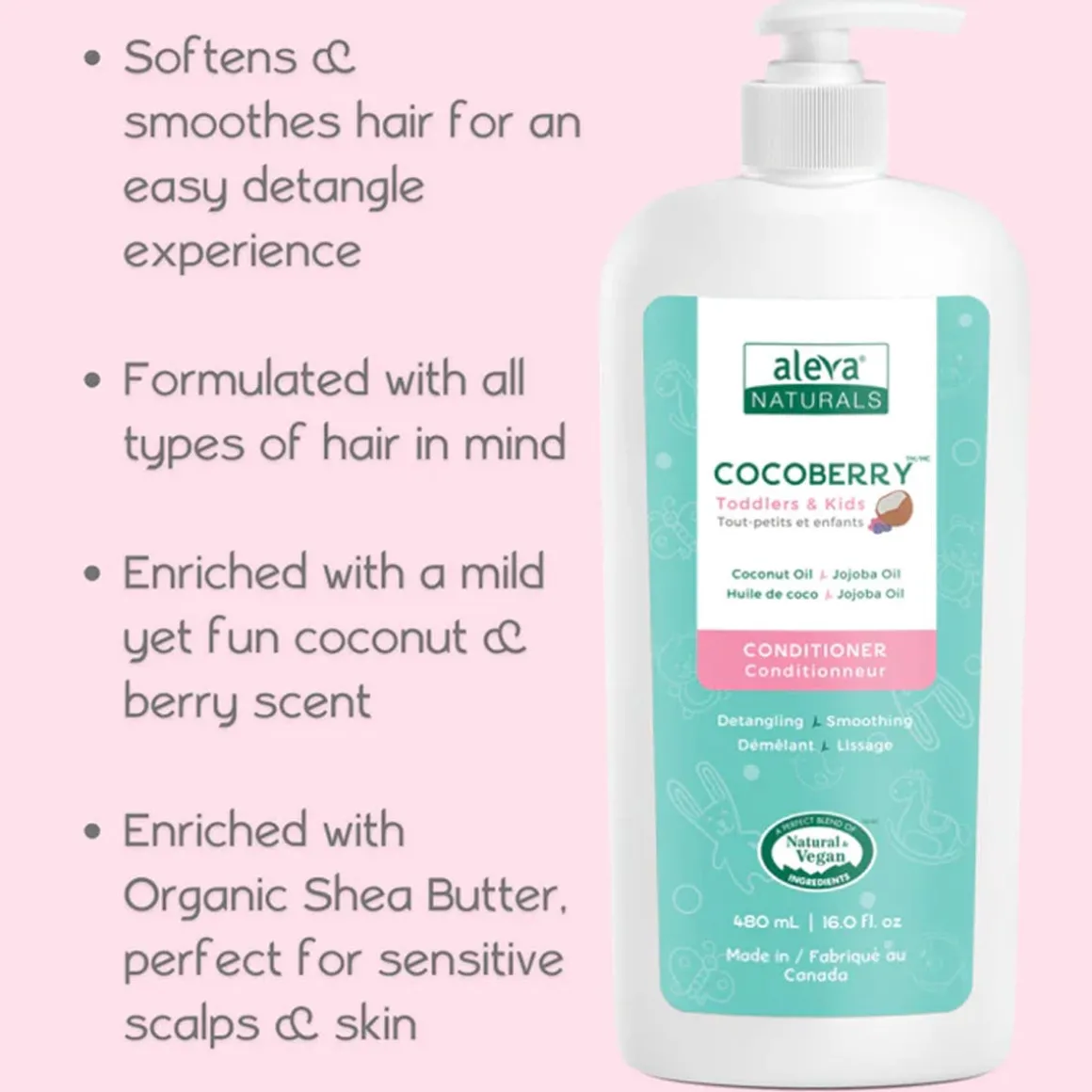 Take care of your kid’s delicate hair with Aleva Naturals COCOBERRY Conditioner. Specially formulated with a blend of Jojoba and Coconut Oils to calm tangles and reduce hair breakage, leaving hair silky smooth. This conditioner is perfect for all hair types & sensitive scalps. It’s infused with our unique COCOBERRY™ scent, making bath time more fun! This conditioner is hypoallergenic, free of parabens, phthalates, sulfates, and dyes. Like all Aleva Naturals products, the COCOBERRY conditioner is made with premium quality ingredients, so you can enjoy a safe product without harsh chemicals or additives.