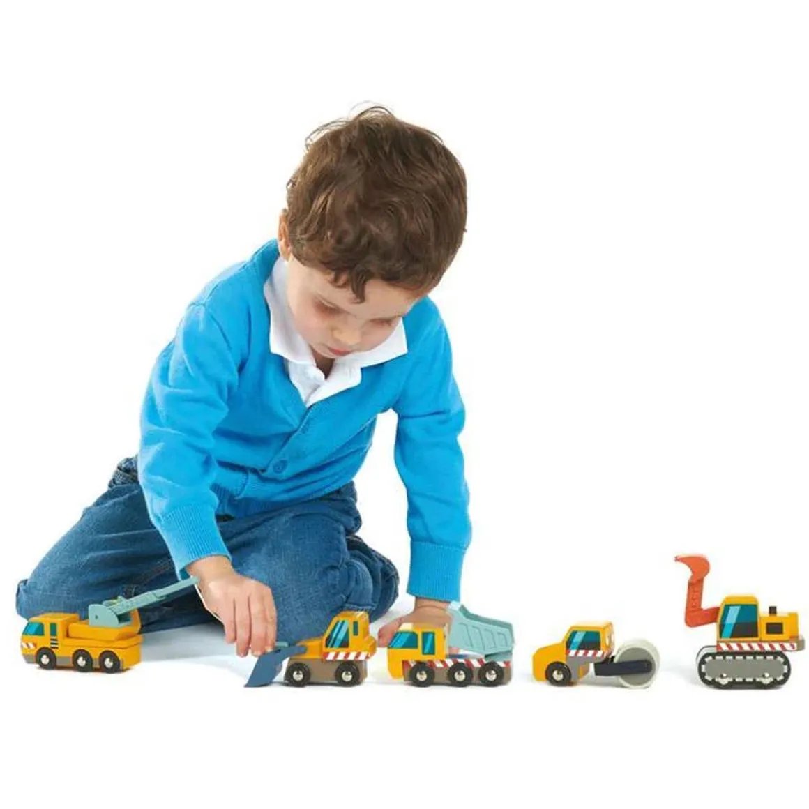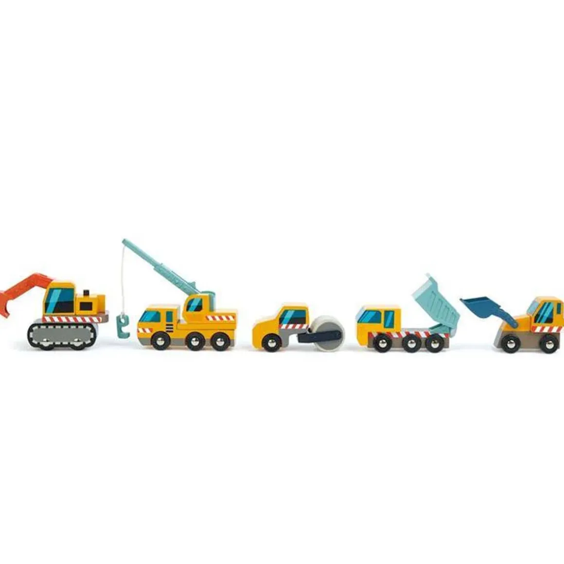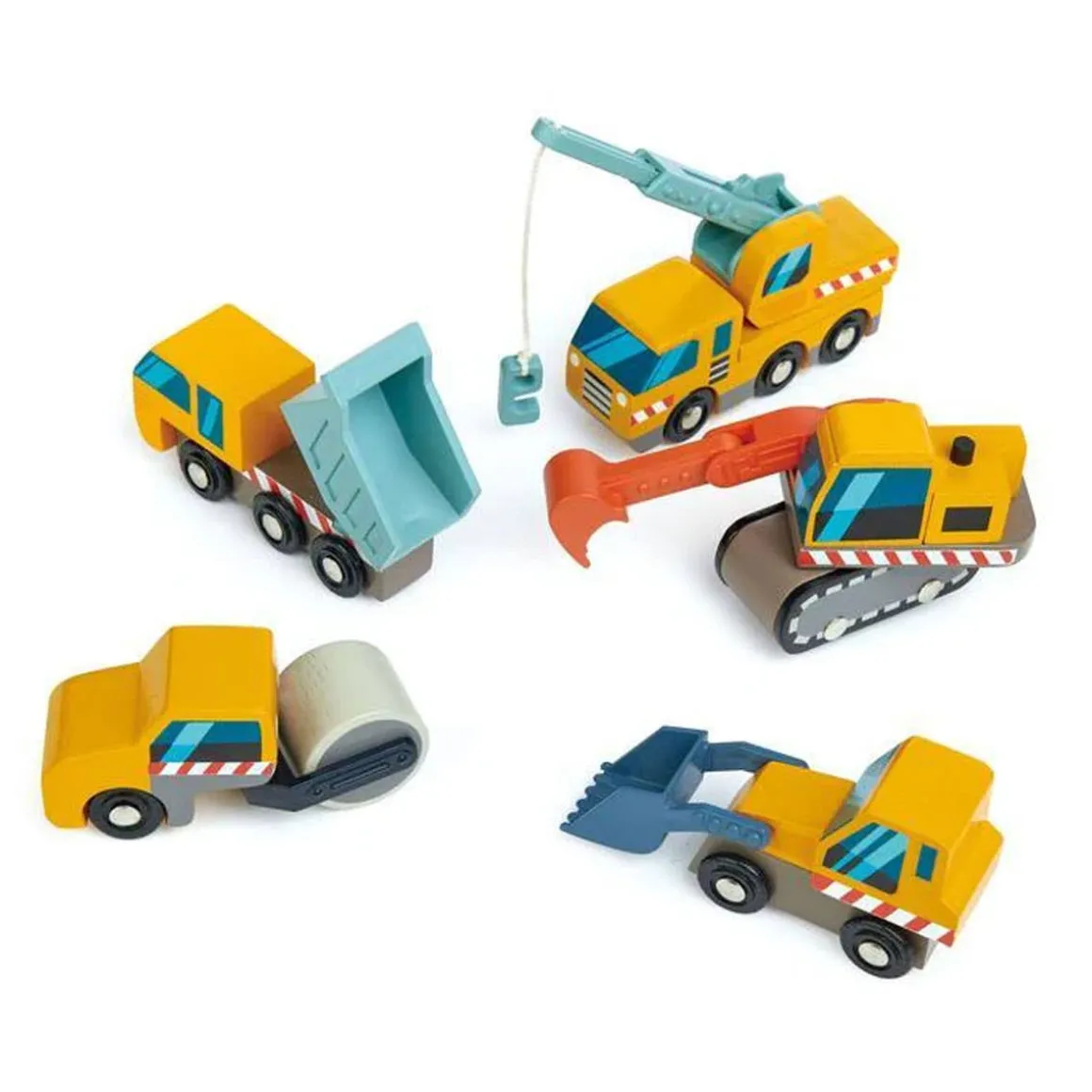 A collection of construction vehicles, including dump truck, front loader, excavation digger, crane truck, road roller. All with moving parks and painted in realistic and contemporary colors. Standard wheel width fits on all train track.