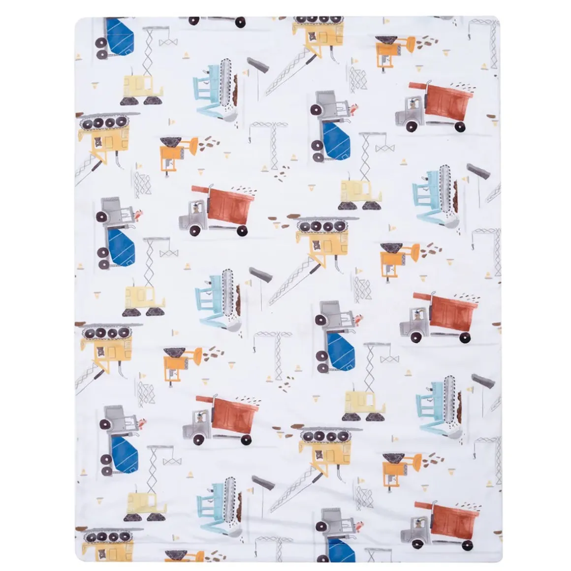 - Features colorful construction vehicles