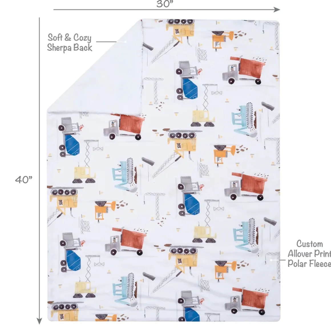 Wrap your little one in comfort with this soft and cozy baby blanket. The front is polar fleece material featuring colorful watercolor construction vehicles and the back is a warm and cozy white sherpa. It is sized at 30” X 40” making it a perfect sized stroller blanket. This blanket makes a great baby shower gift or welcome home baby gift.