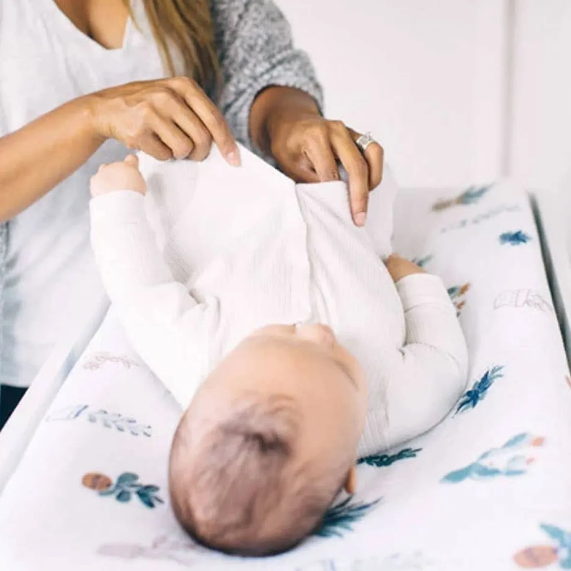 As soft as a baby’s bottom but easier to clean! Designed in our signature prints to match your crib sheets, bibs, and modern nursery. Features an elastic edge for a snug fit and stitched holes for security straps.
