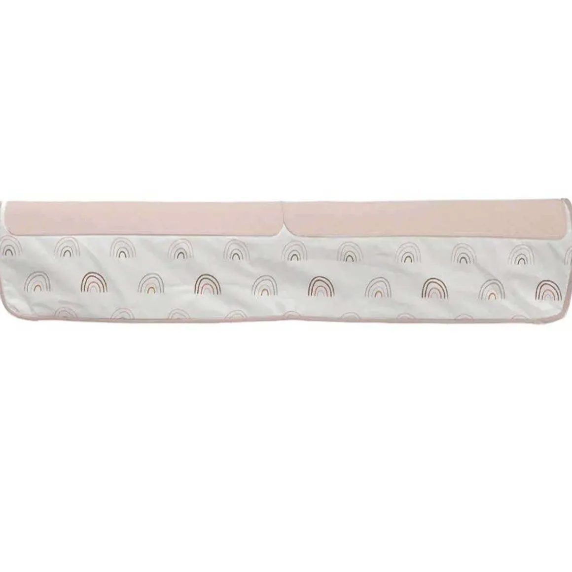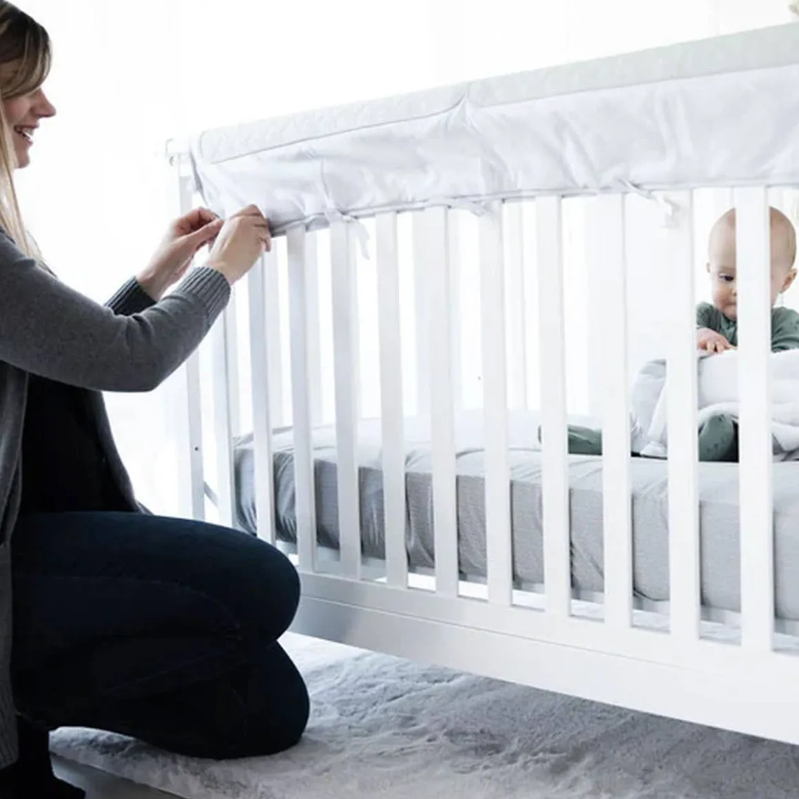 Is your little baby in beaver mode? If your little one is making a meal of your crib then look no further. The Malarkey Kids Crib Chomper™ is the smart crib rail guard. It protects your baby from ingesting paint, wood, & damaging little teeth. The Crib Chomper™ features soft, padded, drool absorbent fabric + a layer of textured, chewy food-grade silicone to protect both crib & baby! Fits most standard and convertible crib rails. Simply fold fabric over with silicone side facing up and secure hook and loop around crib rails.