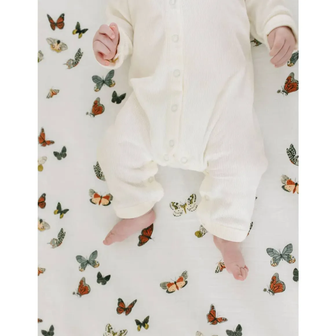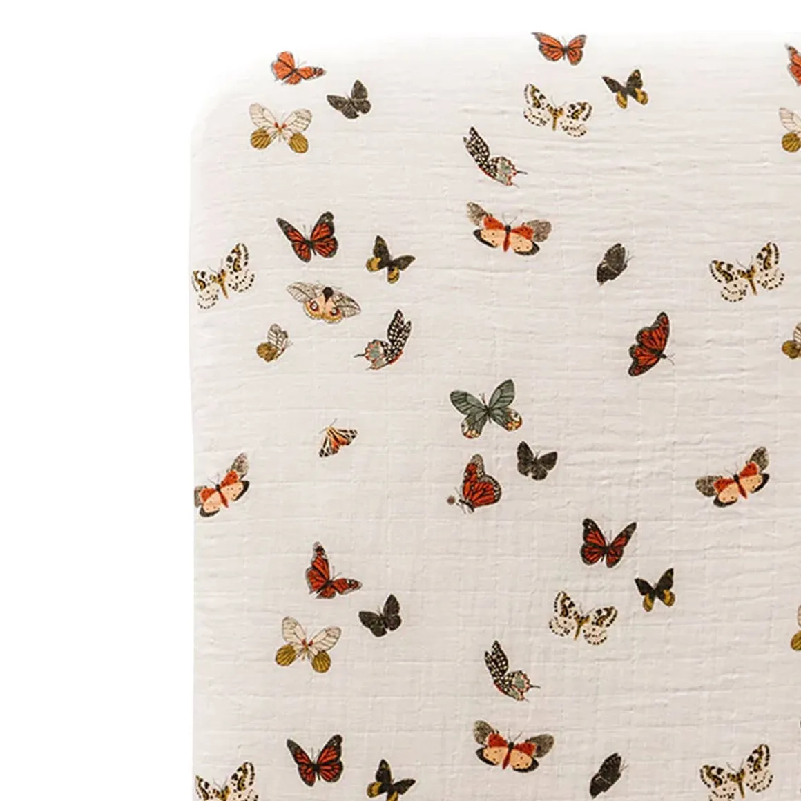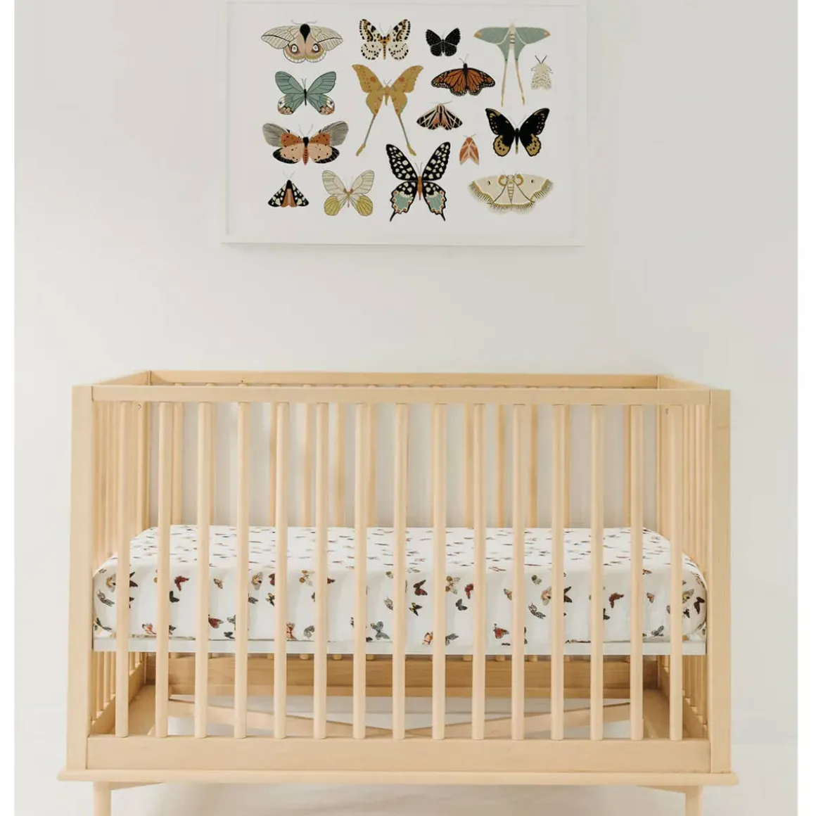 Butterfly in the skyyy, I can go twice as high. Take a look, our Butterfly Migration Crib Sheet has our hearts all a flutter.