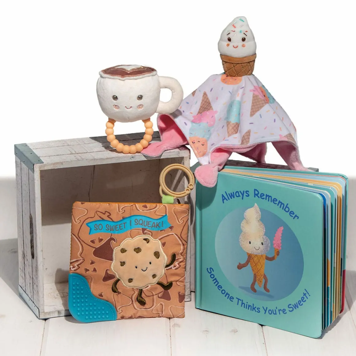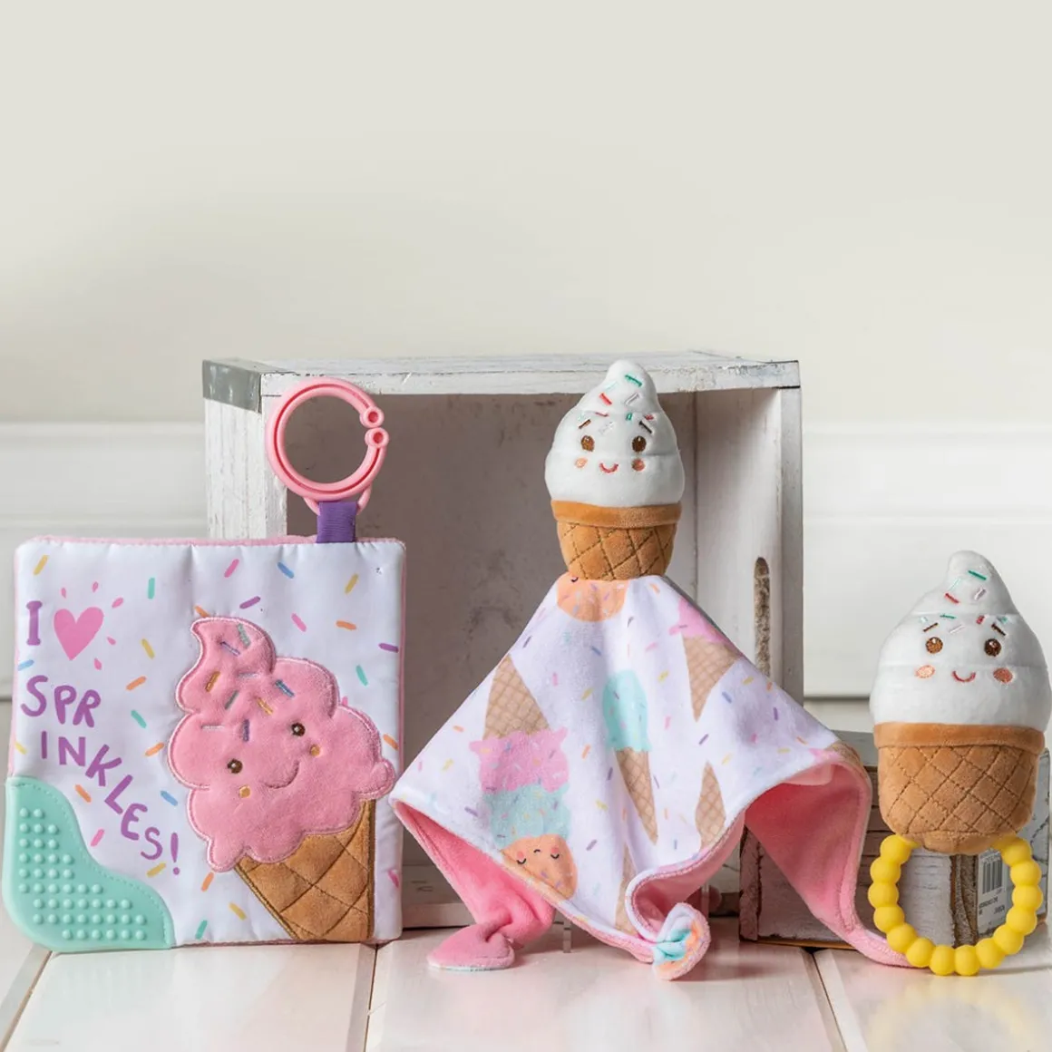 A true standalone item – part soother, part activity toy. Each Crinkle Teether has fun character appliques and colorful patterns on the outside, crinkle paper and a squeaker on the inside.