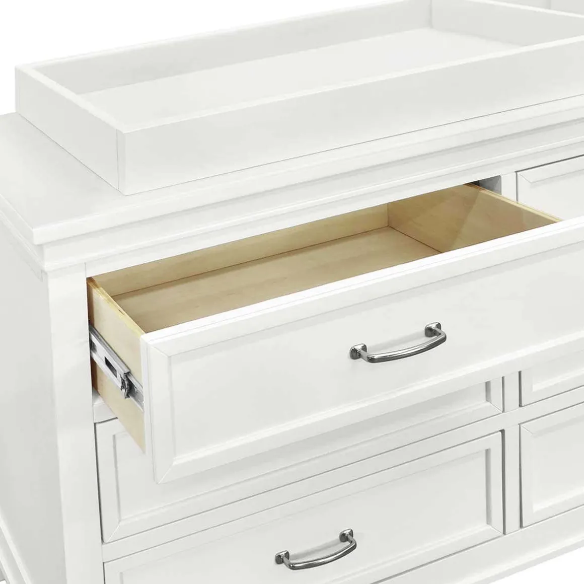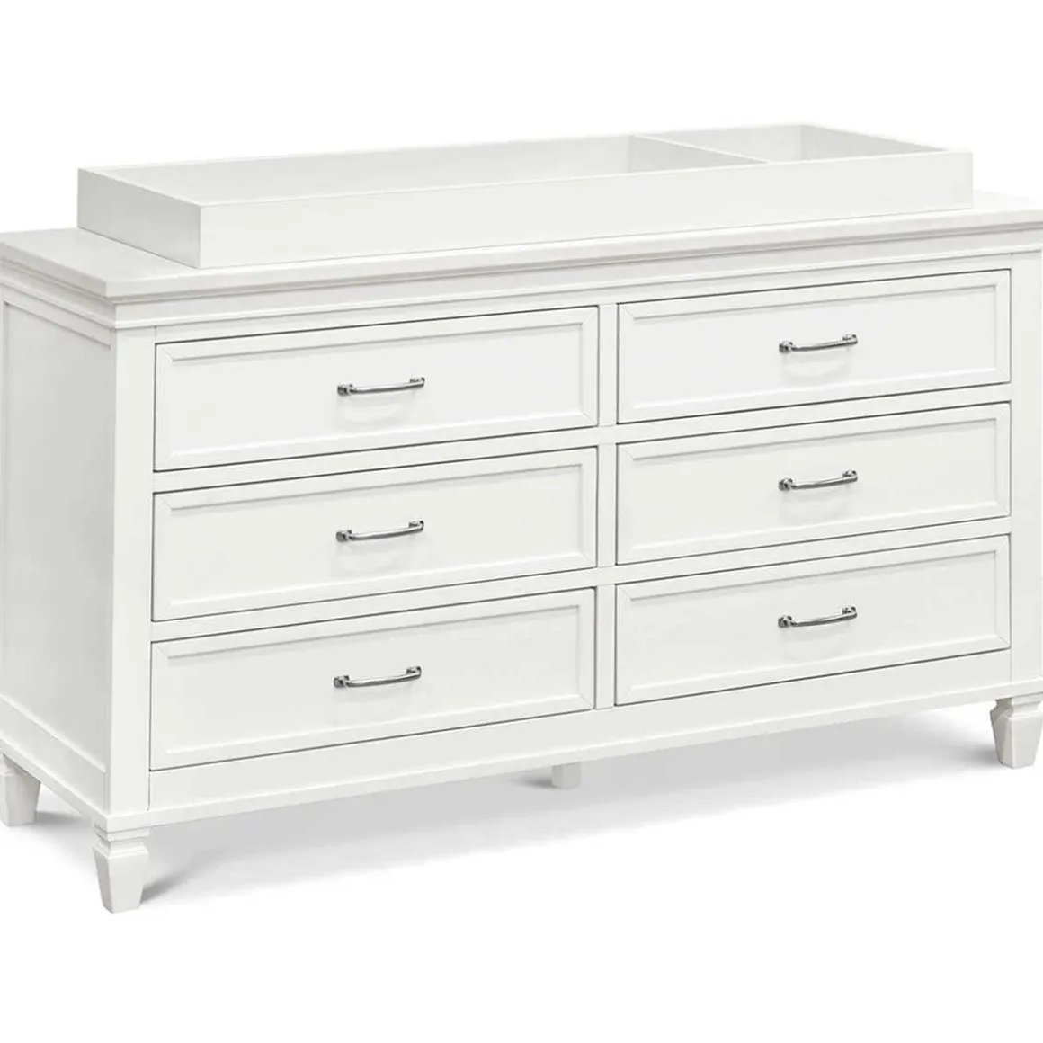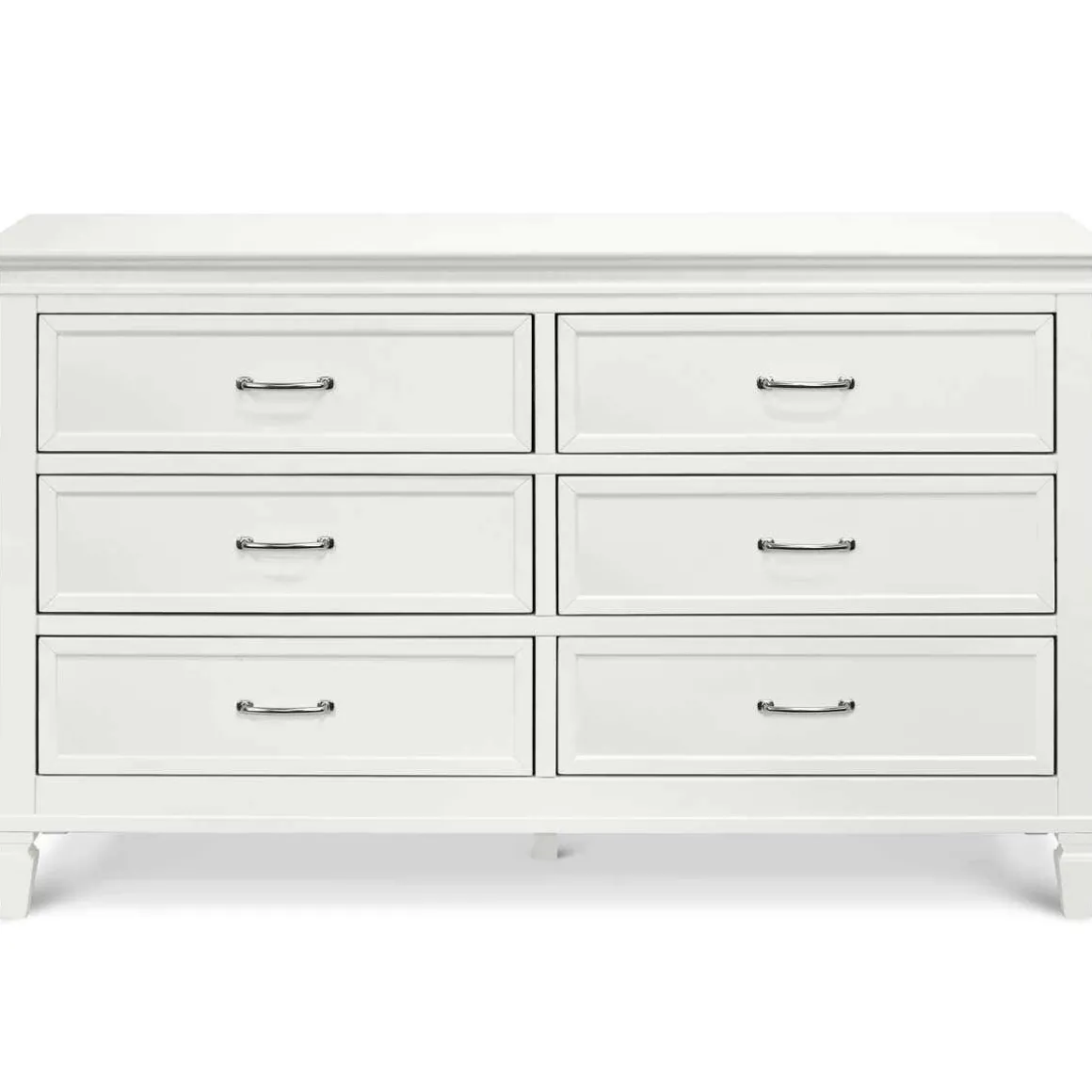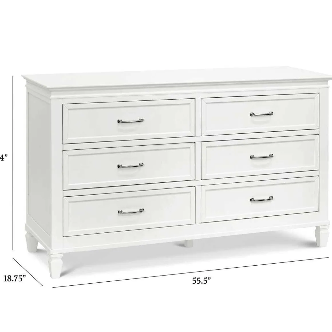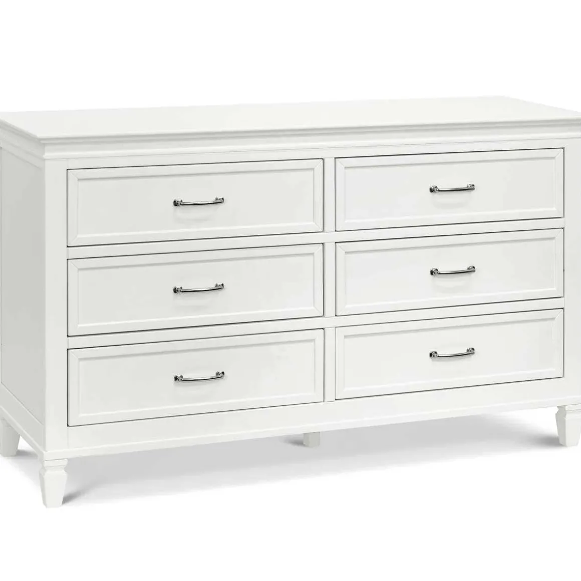 Bring the elegance of romantic French country inspired style into the home with the Darlington 6-Drawer Dresser. The dresser balances classic raised molding on six drawer fronts, delicate tapered feet, and accent satin nickel drawer handles. All spacious drawers feature dovetail construction with self-closing, ball-bearing drawer glides. Available in a Warm White finish.
