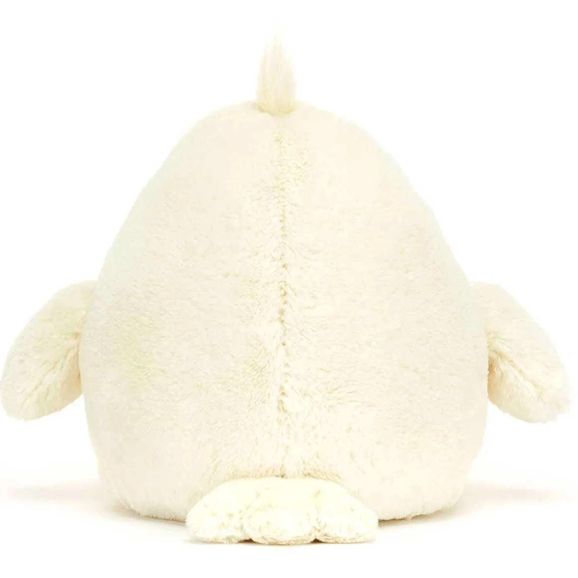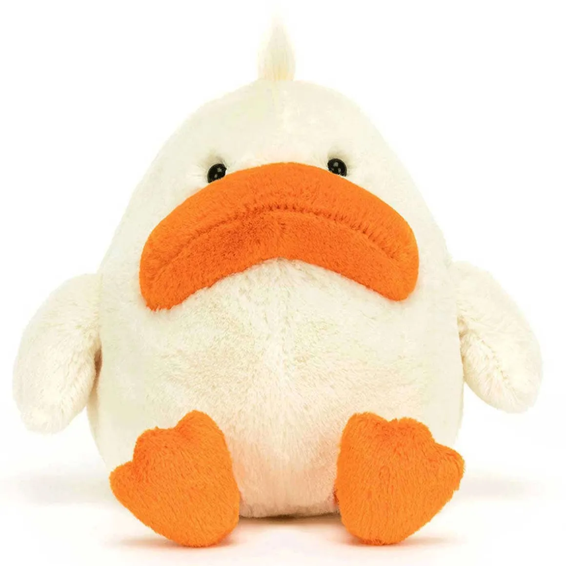 Head down to the pond to find Delia Duck. Super soft in cream fur, Delia has a matching tuft of long hair and short, wide wings. With bright orange feet and a matching sad beak, this grumpy duck prefers cuddles over bread.