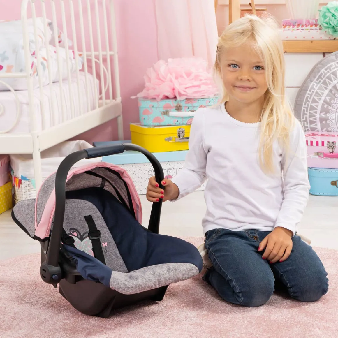This modern doll’s car seat, in a fashionable color, is suitable for dolls up to 46cm. It features a comfortable fabric and an integrated sunshade, ensuring the doll or plush toy is comfortably seated and protected from sun and wind. An integrated seat belt secures the doll or toy, promoting safe travels and sweet dreams. The car seat’s ergonomic handle, adjustable to the back or middle, makes it easy to carry. When placed on the floor, the car seat can rock with a gentle push. Additionally, it is compatible with the Neo Vario or Xeo doll’s pram, offering versatility in how it’s used.