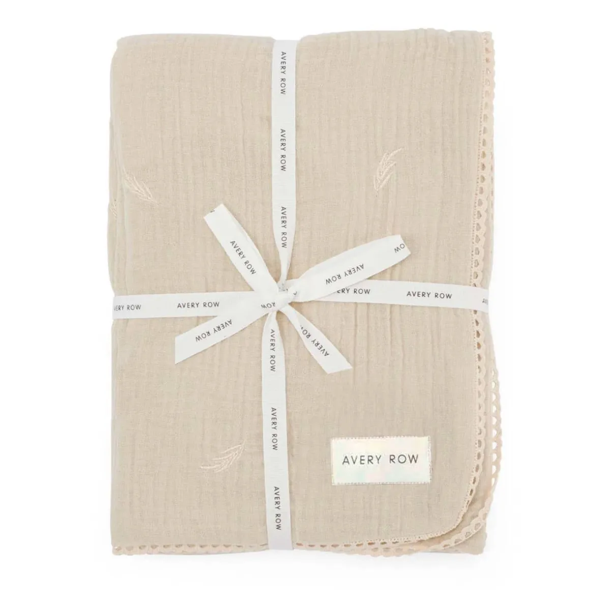 Introducing Avery Row’s new 4-layer muslin blanket. Embroidered on one side with a beautiful grass motif and finished with a delicate lace trim, this lightweight and breathable blanket is perfect for your little one, and makes a lovely gift.