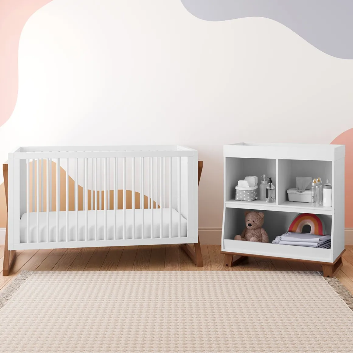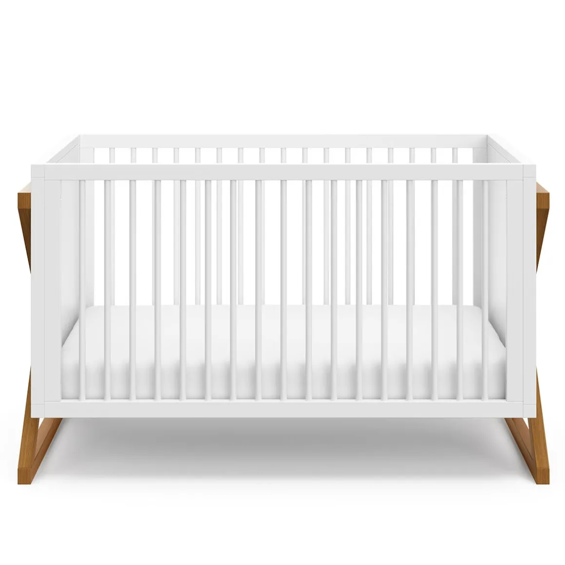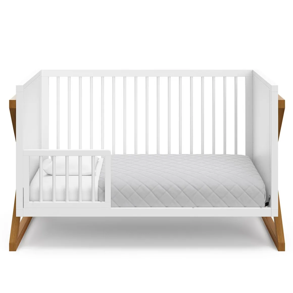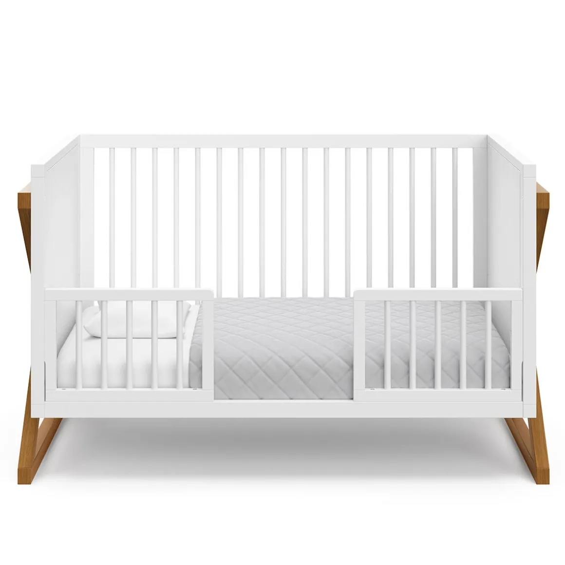 The Storkcraft Equinox 3-in-1 Convertible Crib is an iconic Storkcraft design. The Equinox’s signature geometric design is complemented by its modern two-tone colourway. The Equinox will infuse your child’s room with style for years to come. As a crib, the Equinox has an adjustable mattress support base with 3 different heights, to see your infant through all of the baby stages. When your baby is ready to graduate from the crib stage, the Equinox converts to a daybed and a toddler bed. Like all Storkcraft cribs, the Equinox is certified by the Juvenile Products Manufacturers Association (JPMA) and meets or exceeds all applicable American Society for Testing and Materials (ASTM International), Consumer Products Safety Commission (CPSC), and Canadian safety standards.