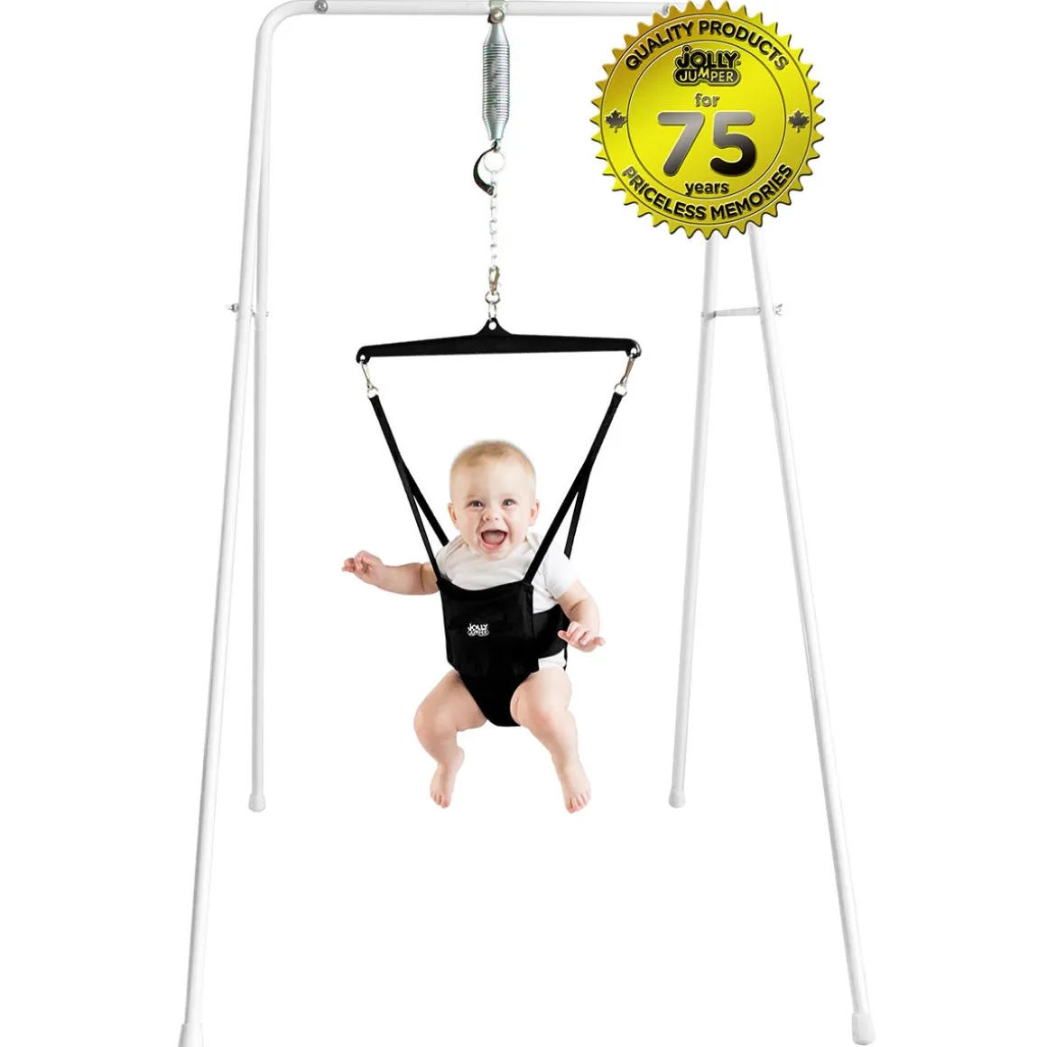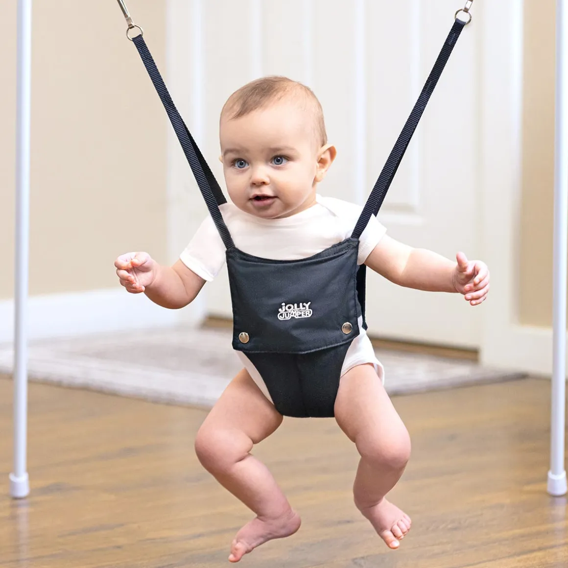 Jolly Jumper Exerciser on a Stand is portable and fits in any room. Door frames are not necessary for this exerciser as the Jolly Jumper is attached to the Stand. Jolly Jumper is the original baby exerciser. The saddle is designed to fit baby like a second skin in much the same way as a surgical back support or weight lifter’s belt fits an adult. Most imitations of our exerciser do not provide this type of support.