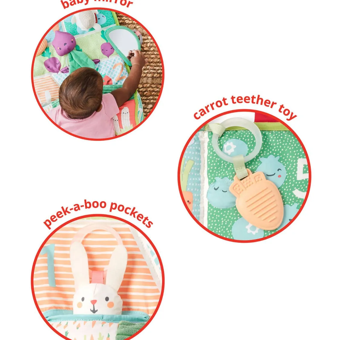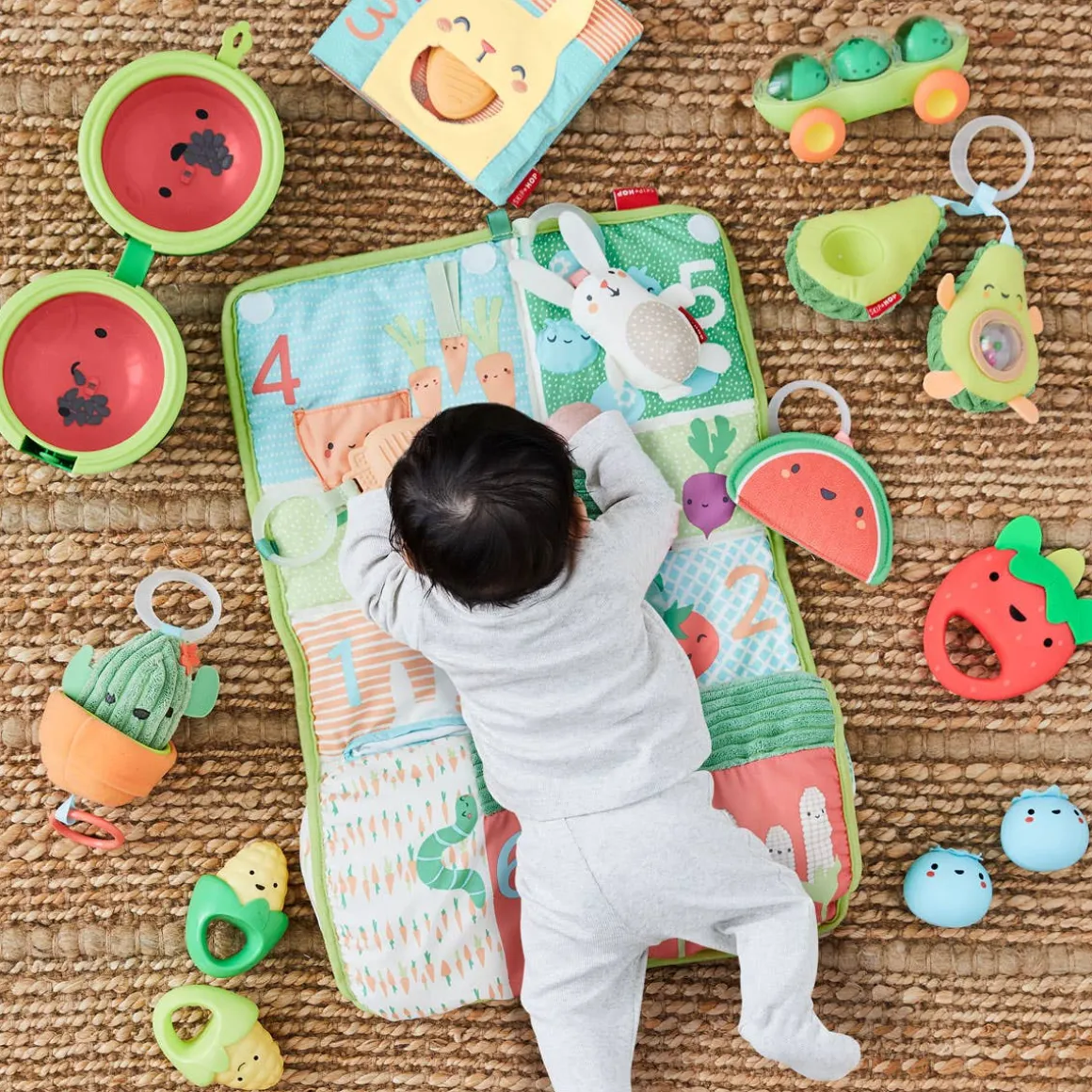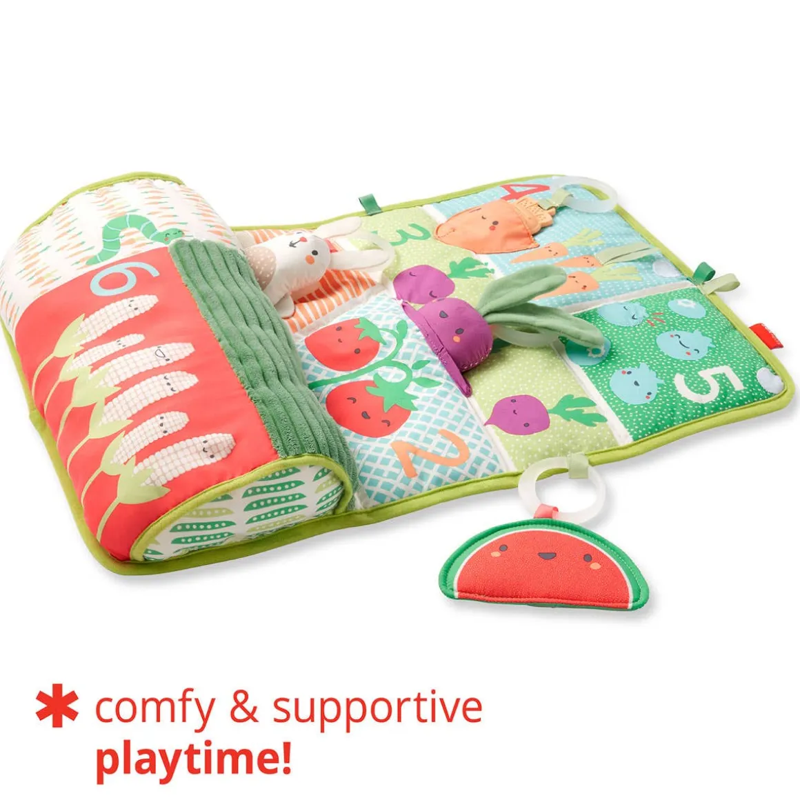 - 4 engaging toys: Beet rattle, Carrot teether toy, Crinkle bunny, Watermelon baby mirror
