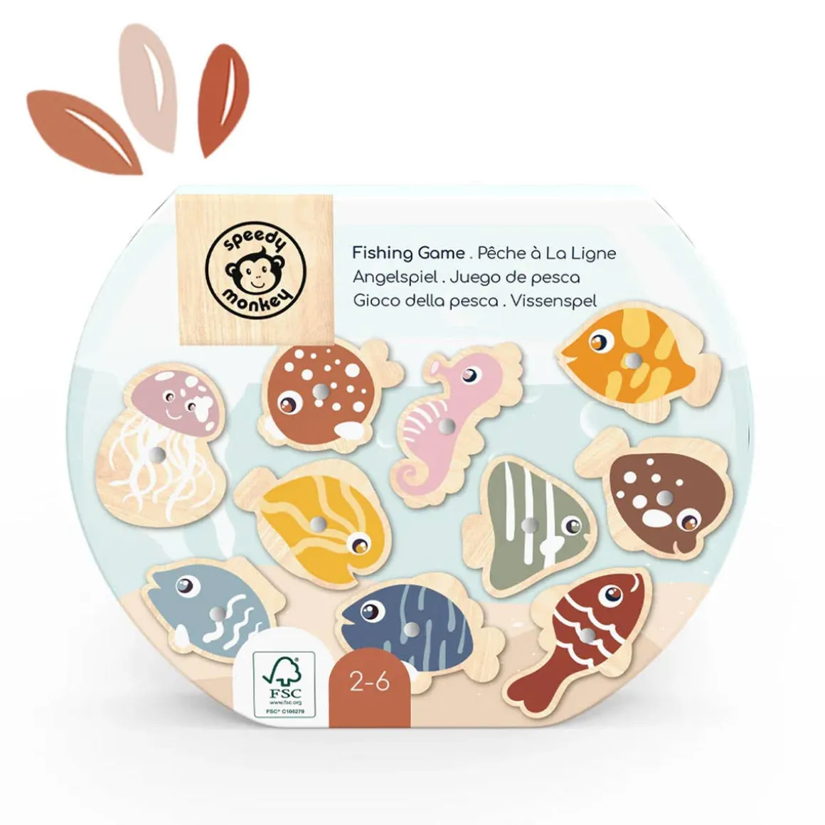 Time to go fishing. Grab your fishing rod for a fun time! These colorful wooden fish can be hooked up by the magnetic rod and once safely attached, lowered back onto the wooden board. Requires skill and concentration to catch each fish. Helps to develop dexterity and co-ordination. This toy is crafted from sustainably sourced wood from FSC® certified forests and coated with non toxic paint