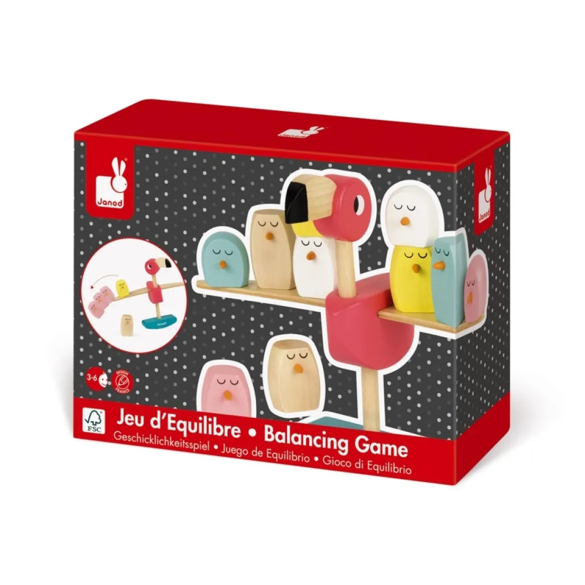 Solid wood balancing game. Water-based paint. Comprised of a pink flamingo with removable wings, a culbuto base and 10 small chicks. 3+ players: the aim of the game is for each player to distribute the chicks along the wings of the flamingo without the chicks falling off. But be careful! The person who causes the chicks to fall off loses the game! Wooden game. FSC certified. Delivered not assembled. Water painting.