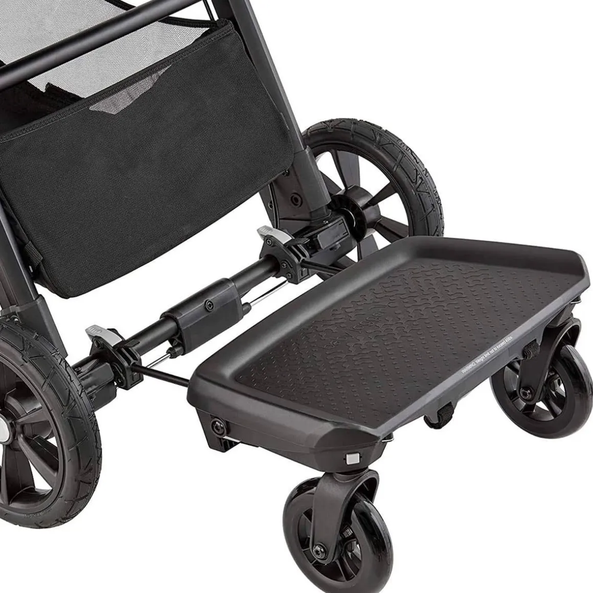 The Glider Board is a great way to let your older child hitch a ride. It attaches easily to the rear axle of your stroller and has a non-slip surface so you know your child will be safe. The Glider Board can flip out of the way when not in use and folds easily even when attached to the stroller. We recommend to try the glider board and the stroller in store before purchasing it with the child that is supposed to use it to make sure everybody is comfortable as the adjustment can vary depending of the child and the parent sizes.