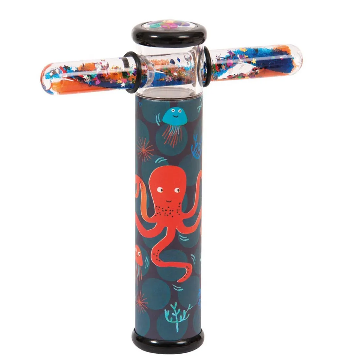 Colorful illustrations with a sliding tube containing gel and glitter at their end, which, combined with the small mirrors of the kaleidoscope, infinitely multiplies the combinations of shapes and colours.