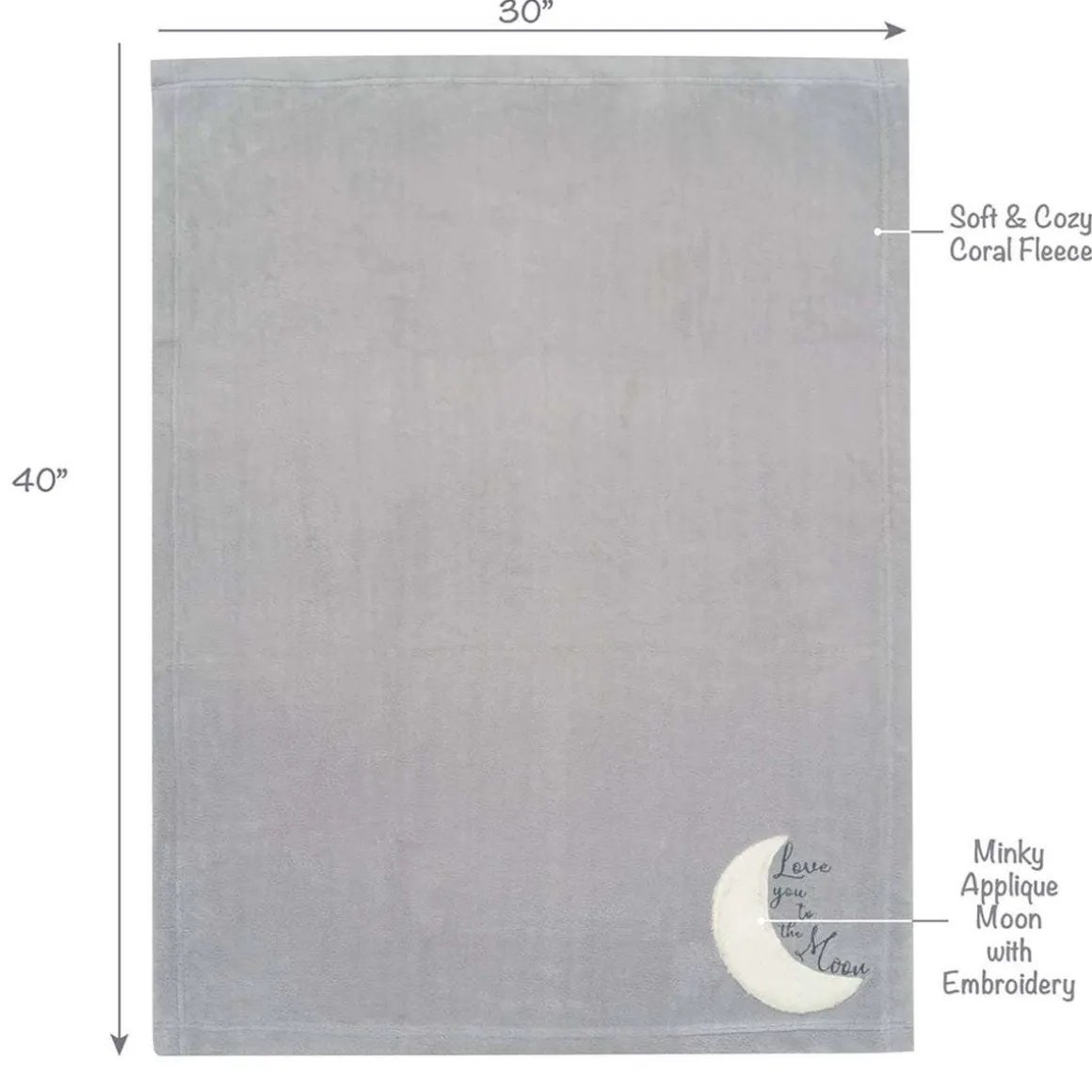 Your little infant is sure to be warm and cozy in this soft fleece baby blanket. There is a 7” crescent moon appliqued in a fluffy white sherpa. The words “Love you to the moon” are expertly embroidered in a gray script style. This blanket is perfectly sized at 30” X 40” and makes a great baby shower gift or welcome home baby gift.
