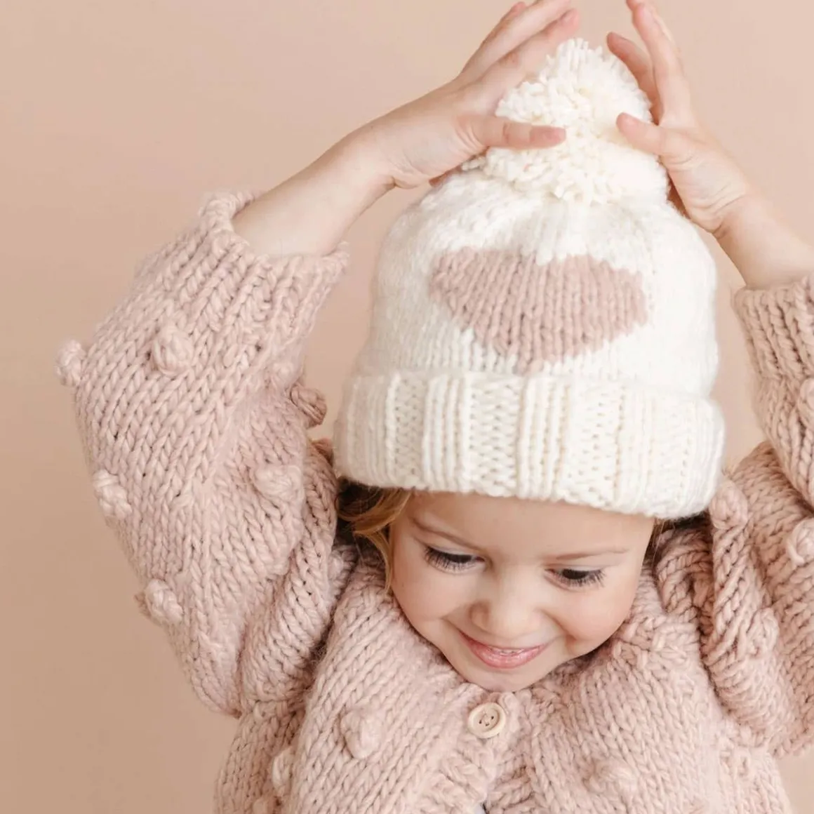 Blueberry hill heart beanie is cream with a blush heart and a fold-over brim.