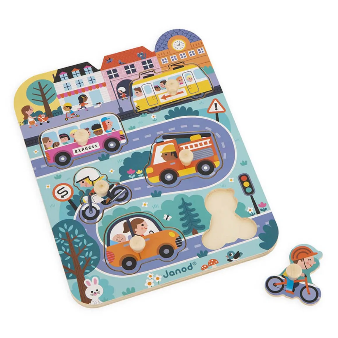 Let’s go, little cars! When you combine children’s early learning with one of their favourite themes, you’ve got it right! With this City peg puzzle, children from 18 months of age can have fun with a developmentally appropriate wooden toy featuring 6 vehicles and their users. Here is a perfect way to work on fine motor skills whilst becoming familiar with the names of all these means of transport. The illustrations are full of life and colour, which will appeal to children who will use their logic in this beautiful world while having fun finding where to put each wooden piece. The size of the pegs is adapted to the hands of toddlers. This wooden early learning puzzle measures 20.8 x 27.5 cm and has a nice rounded shape.