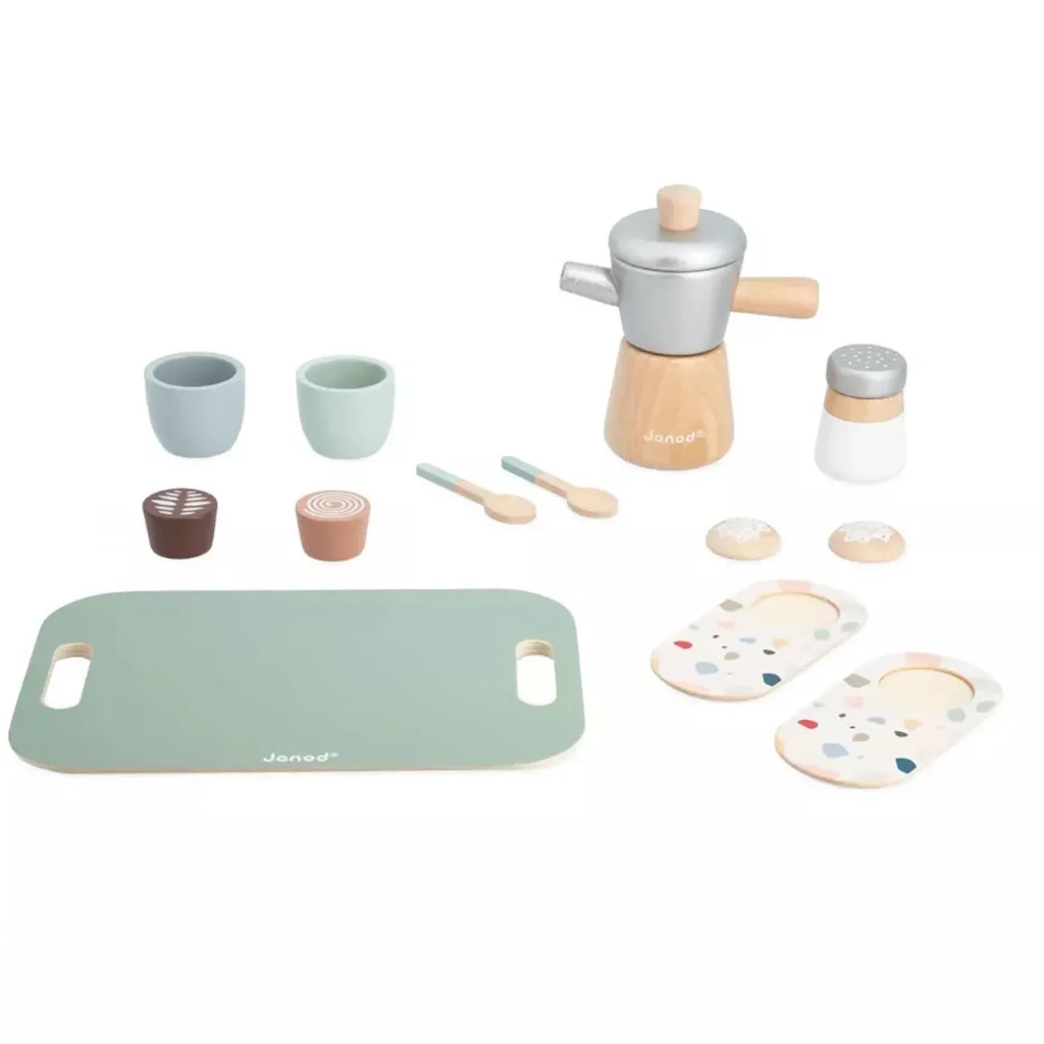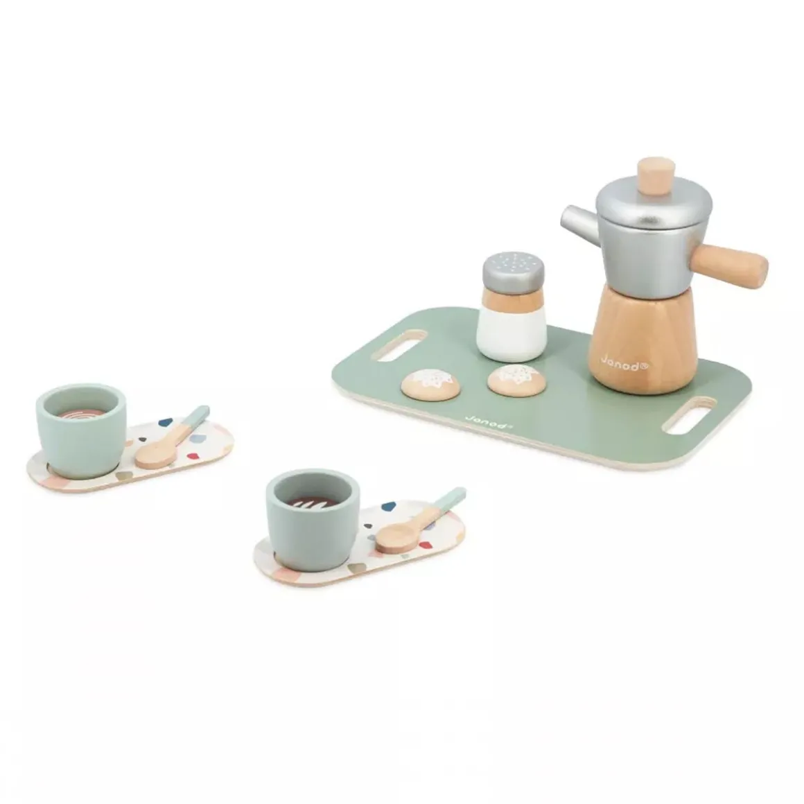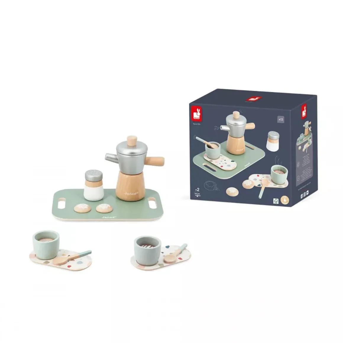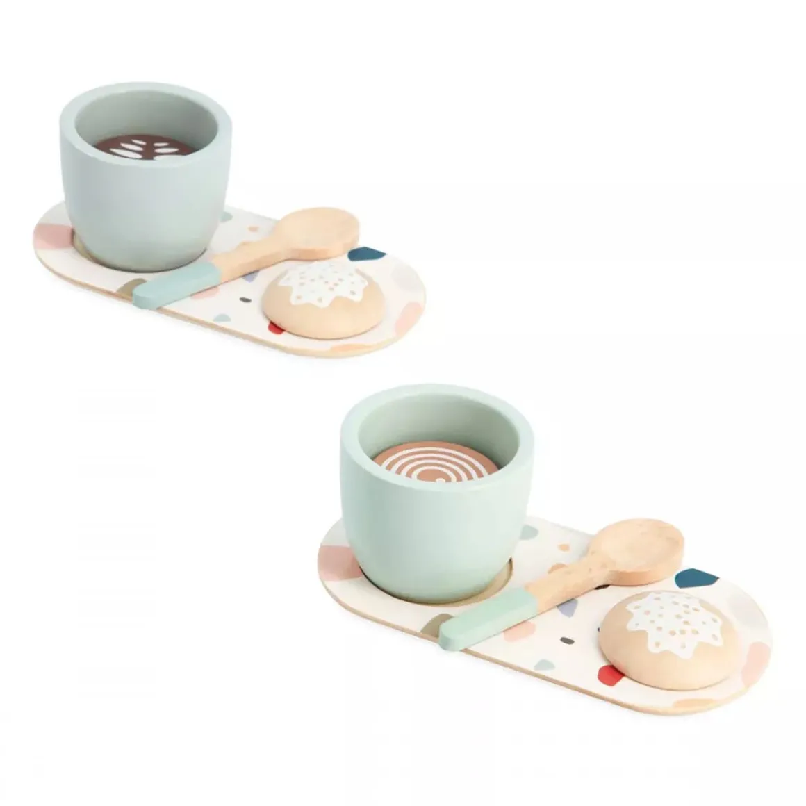 A small coffee? (Re)discover the pleasures of a good Italian coffee with your child and this wooden pretend play set. This 13-piece set has been designed to enhance the end of meals or breakfasts: 1 tray with handles, 1 Italian moka pot, 1 sugar bowl, 2 coffee cups, 2 saucers, 2 teaspoons, 2 biscuits and 2 types of coffee (black and cappuccino). Whether your little one tries to act like the grown-ups at breakfast time, play restaurant or serve coffee to their cuddly toys, this kitchen set will be a hit with the whole family! They can serve the coffee, arrange the cups, balance a delicious biscuit on the saucers and then carry everything over on a tray. Everything children aged 2 years and up will need to stimulate their imagination and enjoy imitating the adults. With its timeless look and Terrazzo pattern, this FSC® wooden coffee service encourages quality time spent with the family.