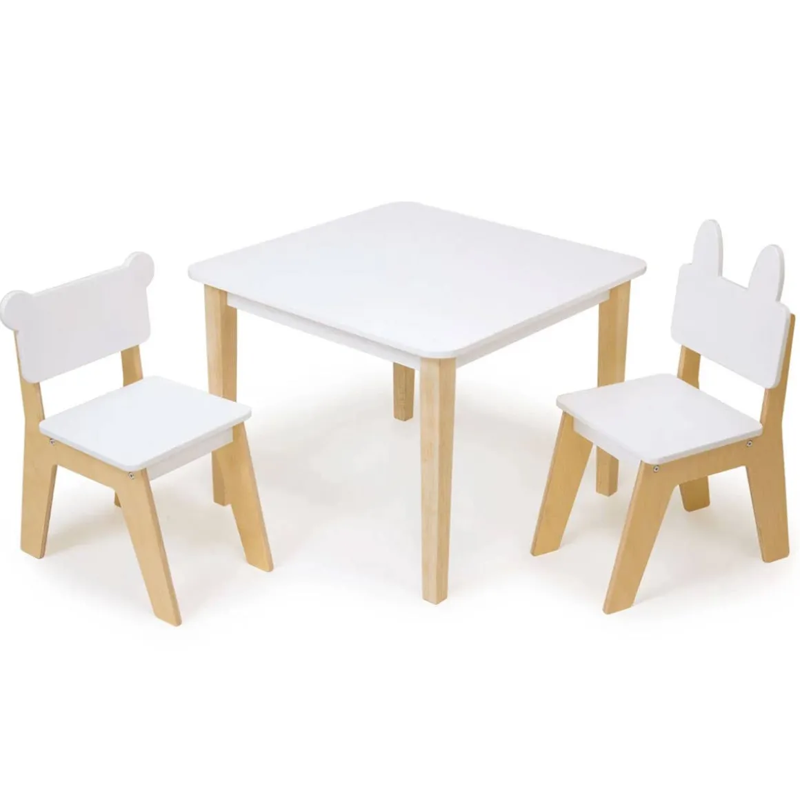 A sturdy and classically simple play table with a bear and rabbit chair included, perfect for children to play table top games, activities, draw and paint, eat a snack, or simply play together whilst sitting down.