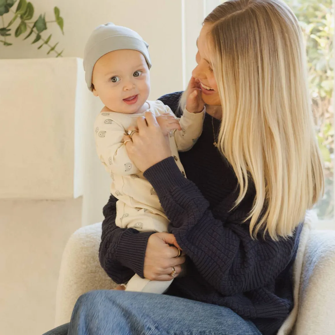 Knotted baby hat made from soft and stretchy brushed jersey for a cozy, comfortable fit.