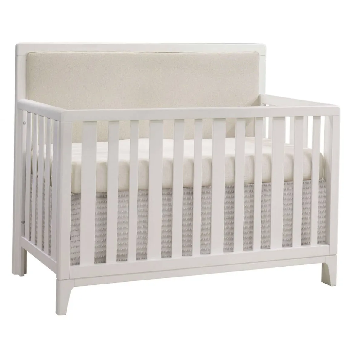 The semi-encased buttonless upholstered panel on the crib headboard is finished with a refined piping that follows the round corners of the headboard.