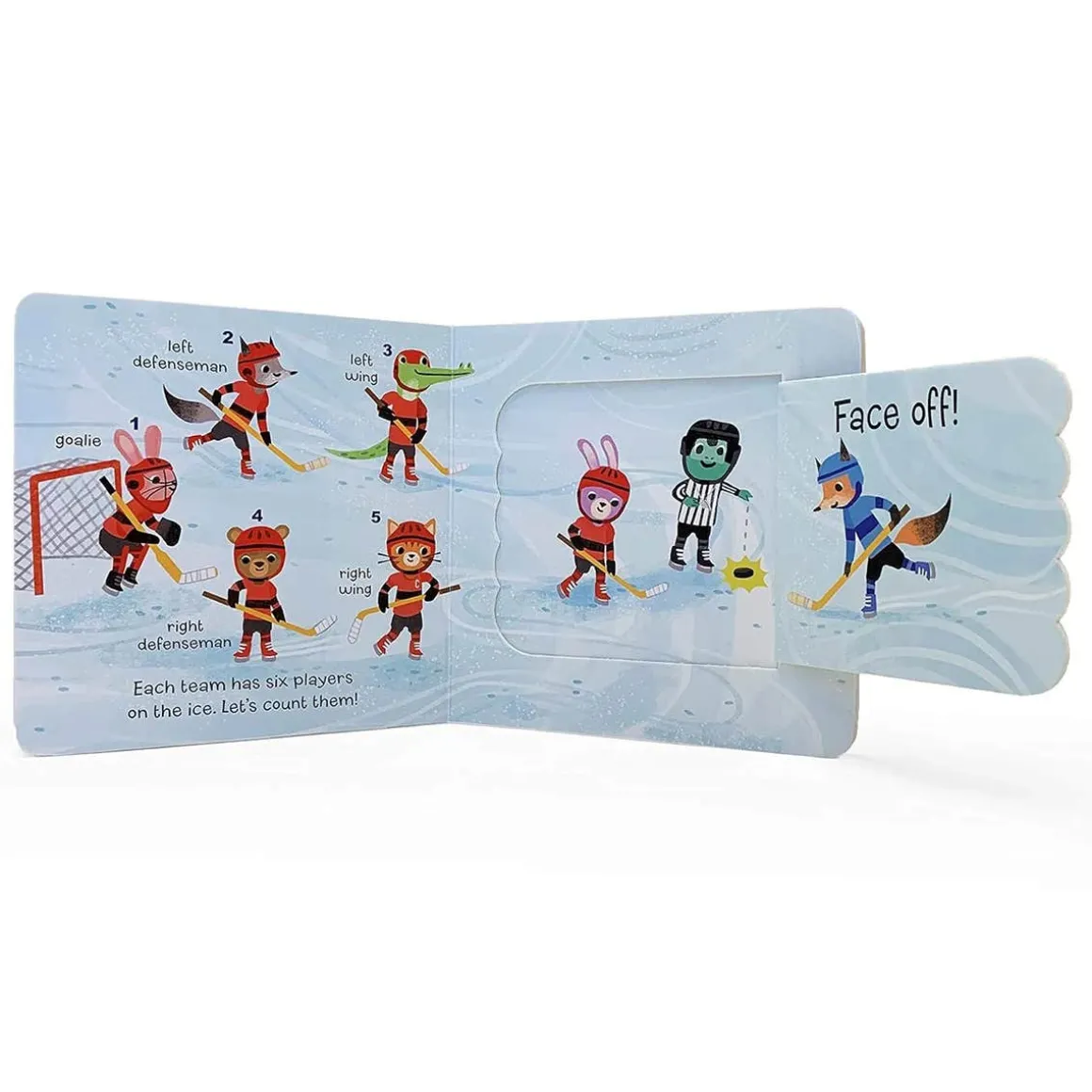 Light the lamp! Introduce your little one to the great sport of hockey in this lively, interactive Lift-a-Flap board book. Learn all about basic game rules, team uniforms, safety equipment, practice drills, and good sportsmanship. Babies and toddlers will love exploring every playful scene filled with animal friends and tons of hockey fun. Thick, durable board pages and easy-to-lift chunky flaps are perfectly sized for little hands andfingers to turn and read along during storytime. This sweet lift-a-flap board is a perfect first book! It is sure to be a winning goal with every little fan! Time to face off!