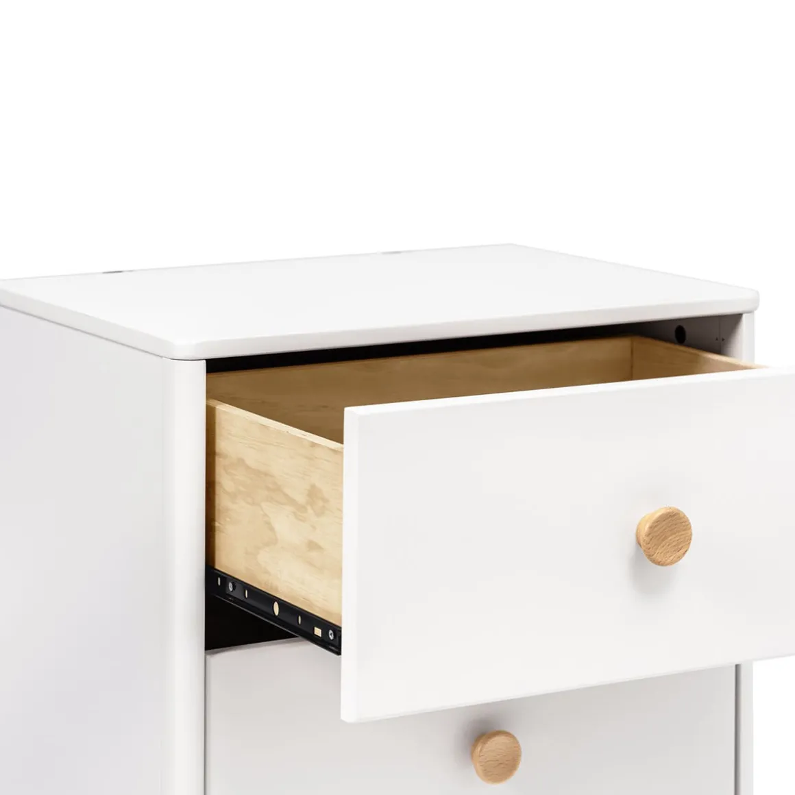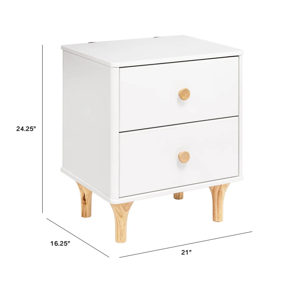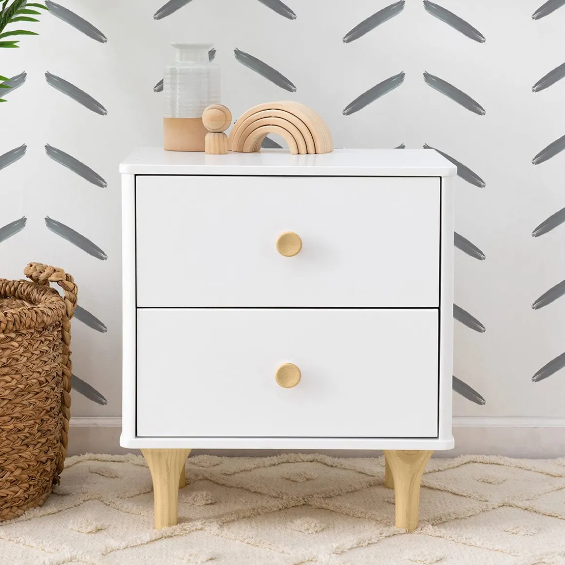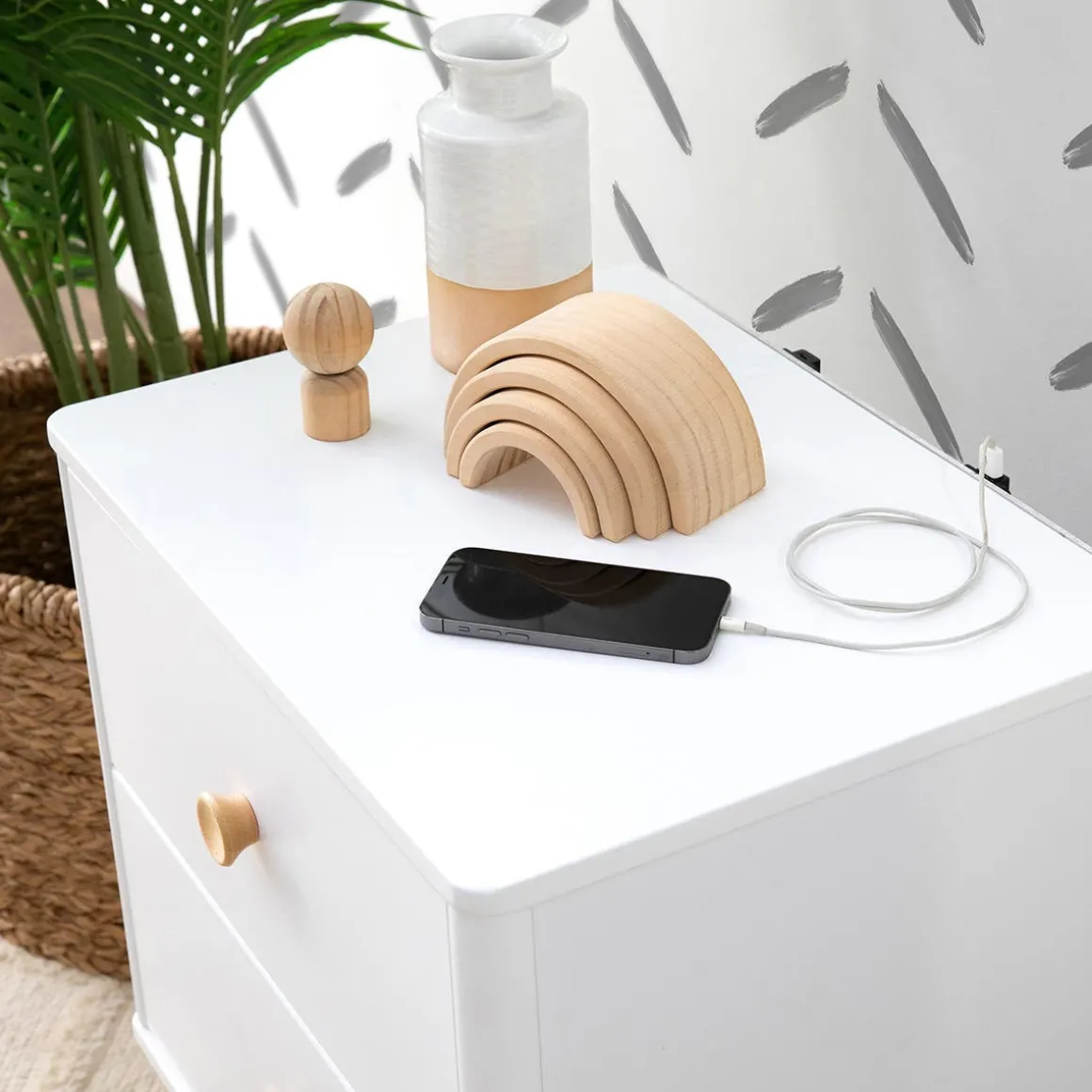 The Lolly Nightstand with USB port is a playfully modern addition to a nursery or kids’ bedroom with gently curved corners, natural wood accents, and two smooth-glide drawers. Easy setup with minimal assembly required.