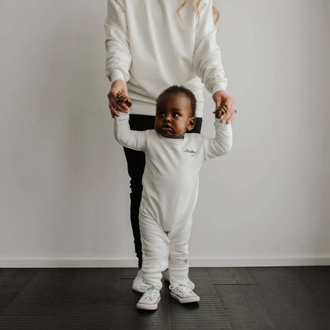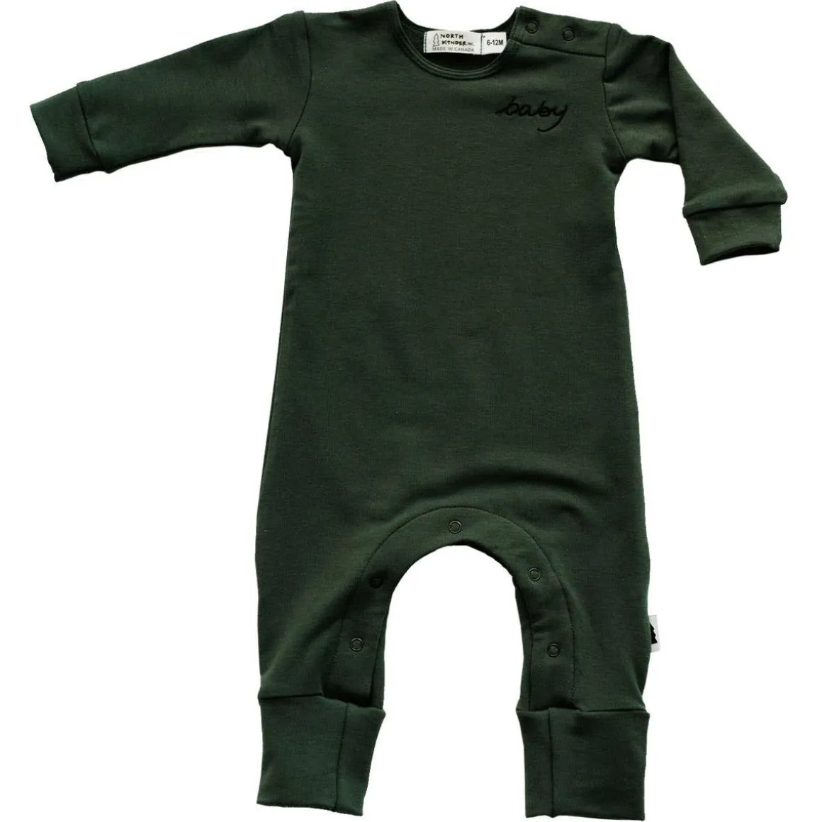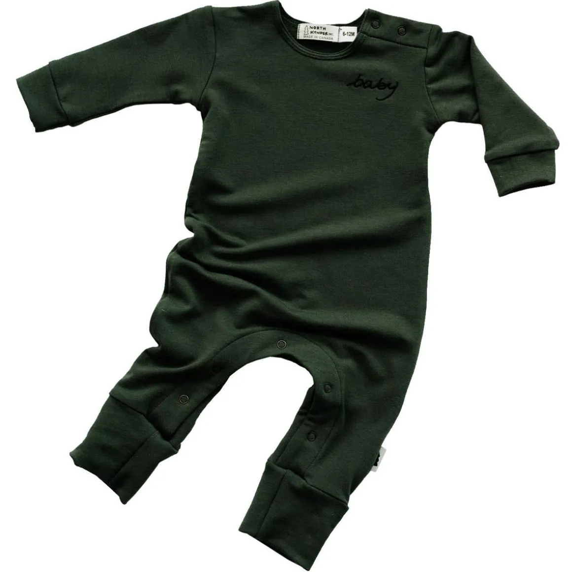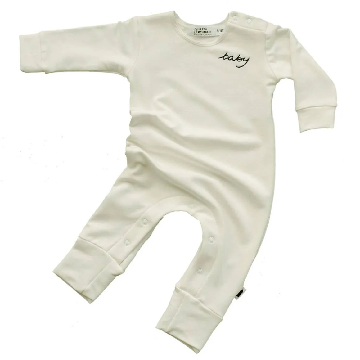 This one-piece makes suiting up and dressing down easy with shoulder and leg snaps. It’s mid weight fabric makes it the perfect everyday piece! On cooler days, add a slouchy hat. We added a stitched “baby” embroidery for the final touch, which matches perfect with North Kinder “mama” styles.