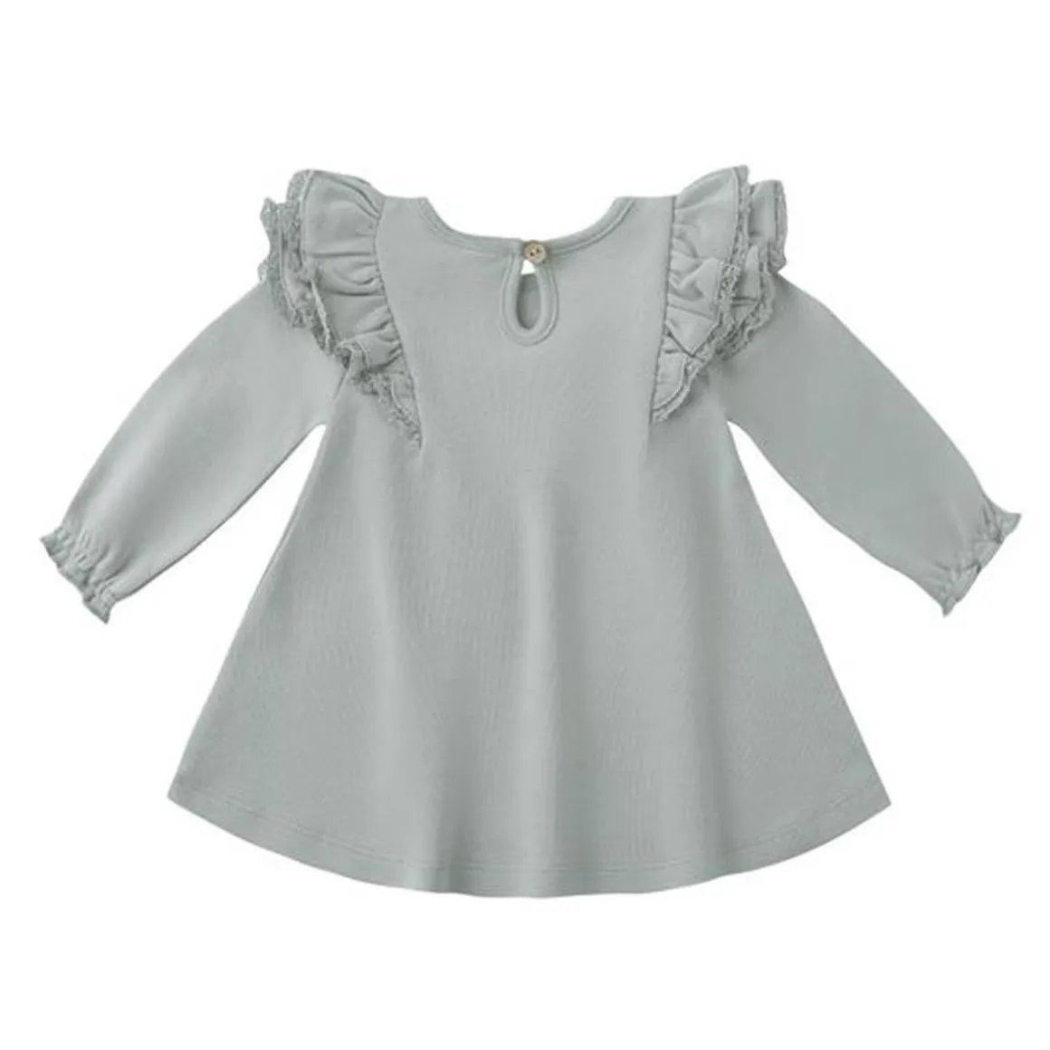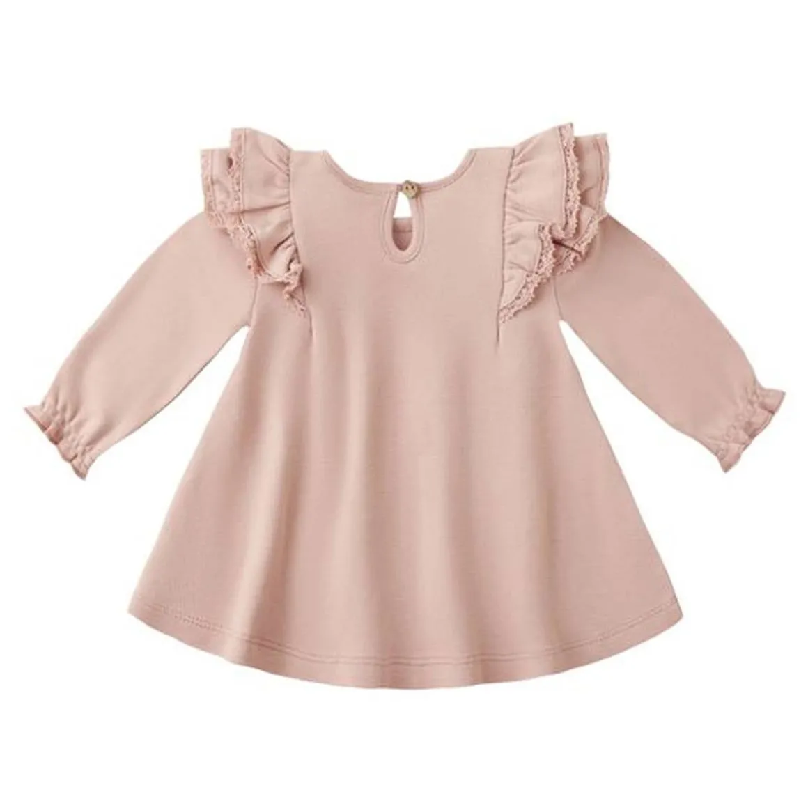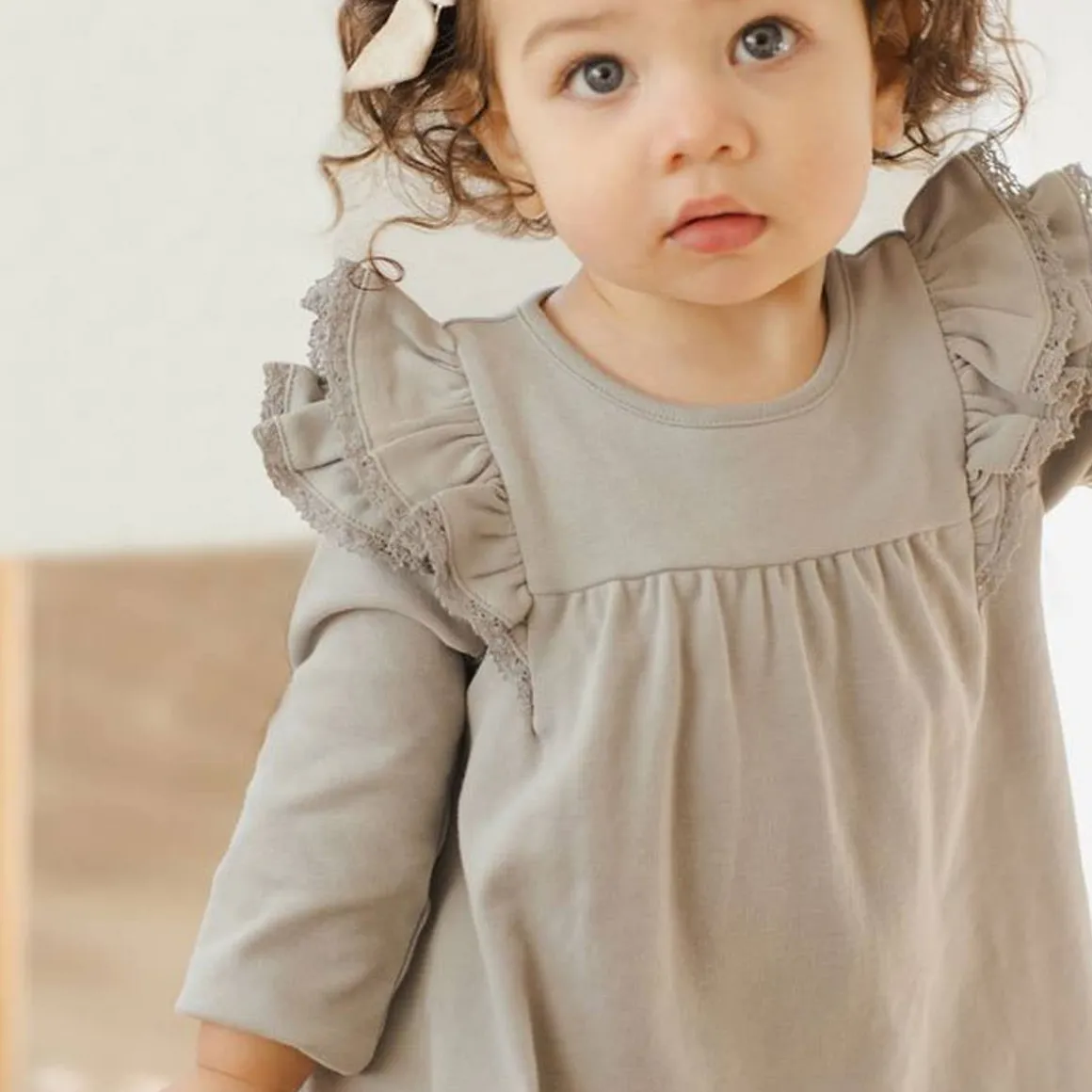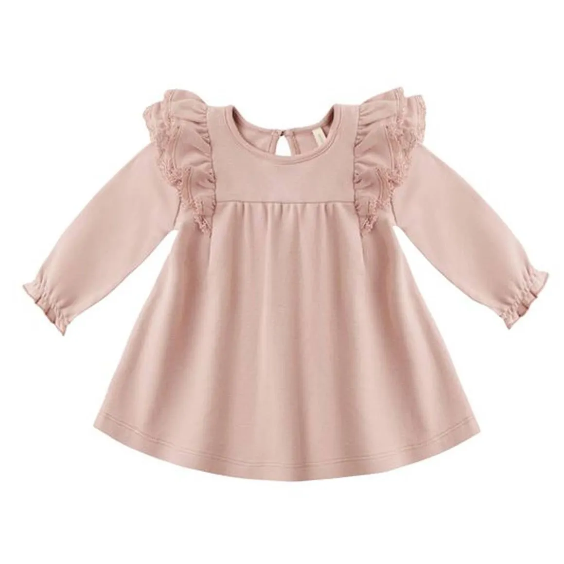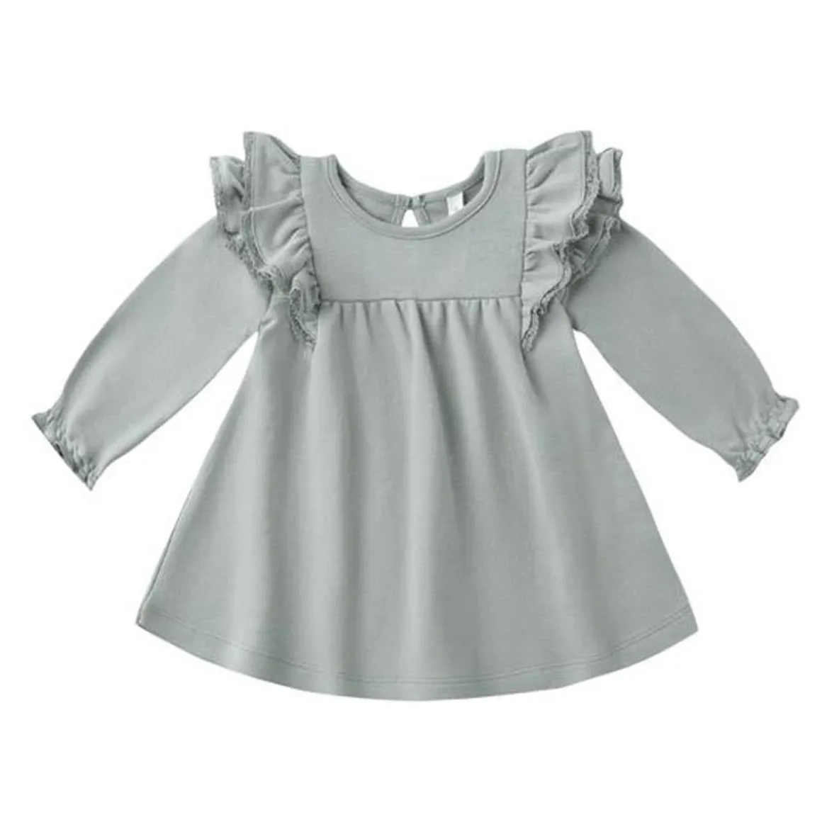 Velvety soft flutter long sleeve baby dress with a button back neck closure. Coordinating bloomers included with all sizes.