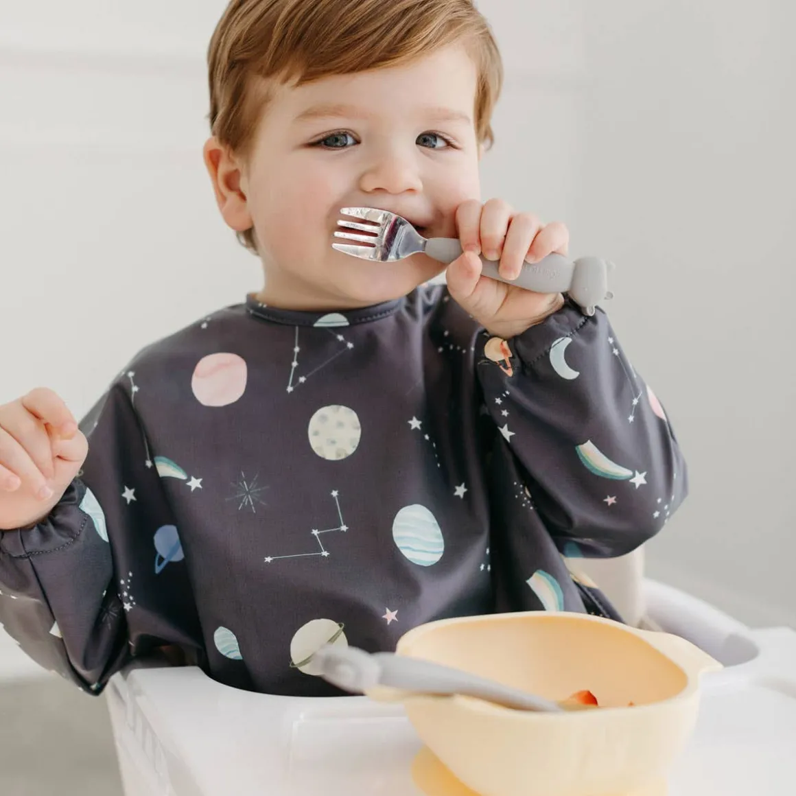 Loulou Lollipop long sleeve waterproof bib is made with 100% eco-friendly recycled polyester with TPU coating that is waterproof, stain, and odor resistant. Standard 100 by Oeko-tex certified. Designed with an adjustable neckline with snaps and elasticized cuffs allow for a comfortable fit that grows with baby to toddler from 6 months to 3 years old.