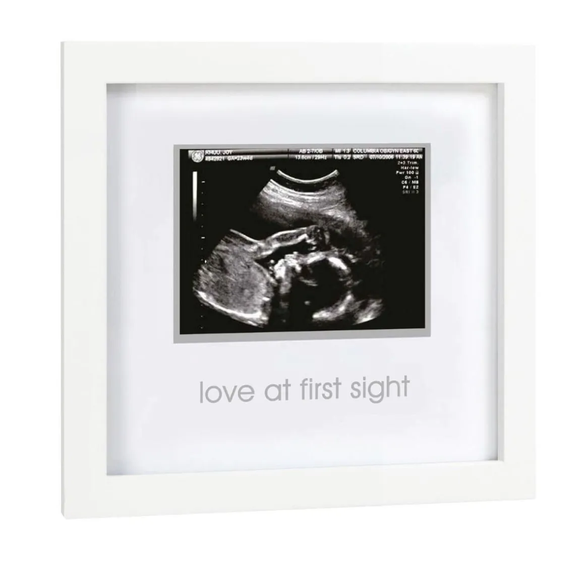 There’s no feeling like seeing your bundle of joy for the first time. Pearhead’s sonogram frame is the perfect keepsake for always cherishing that special moment and your little one. This modern, white wooden frame holds a 3” x 4” sonogram picture. An acid-free beveled mat is included to border the sonogram picture. “Love at first sight” is silver foil stamped on the acid-free beveled mat adding an adorable touch to this keepsake frame. This frame is perfect for setting on any table or desk with the included easel. Or hang the frame in your home with the included sawtooth hanger. Celebrate your new bundle of joy with Pearhead’s sonogram frame.