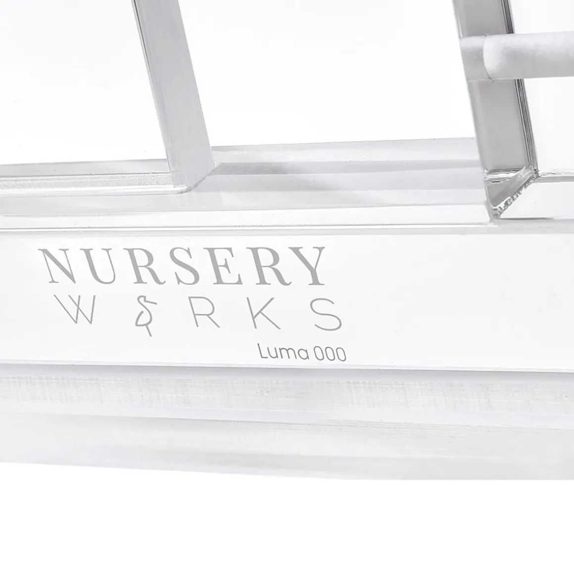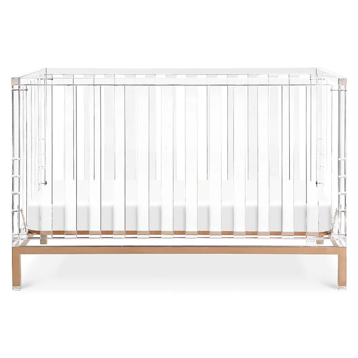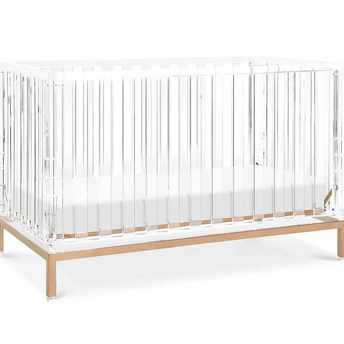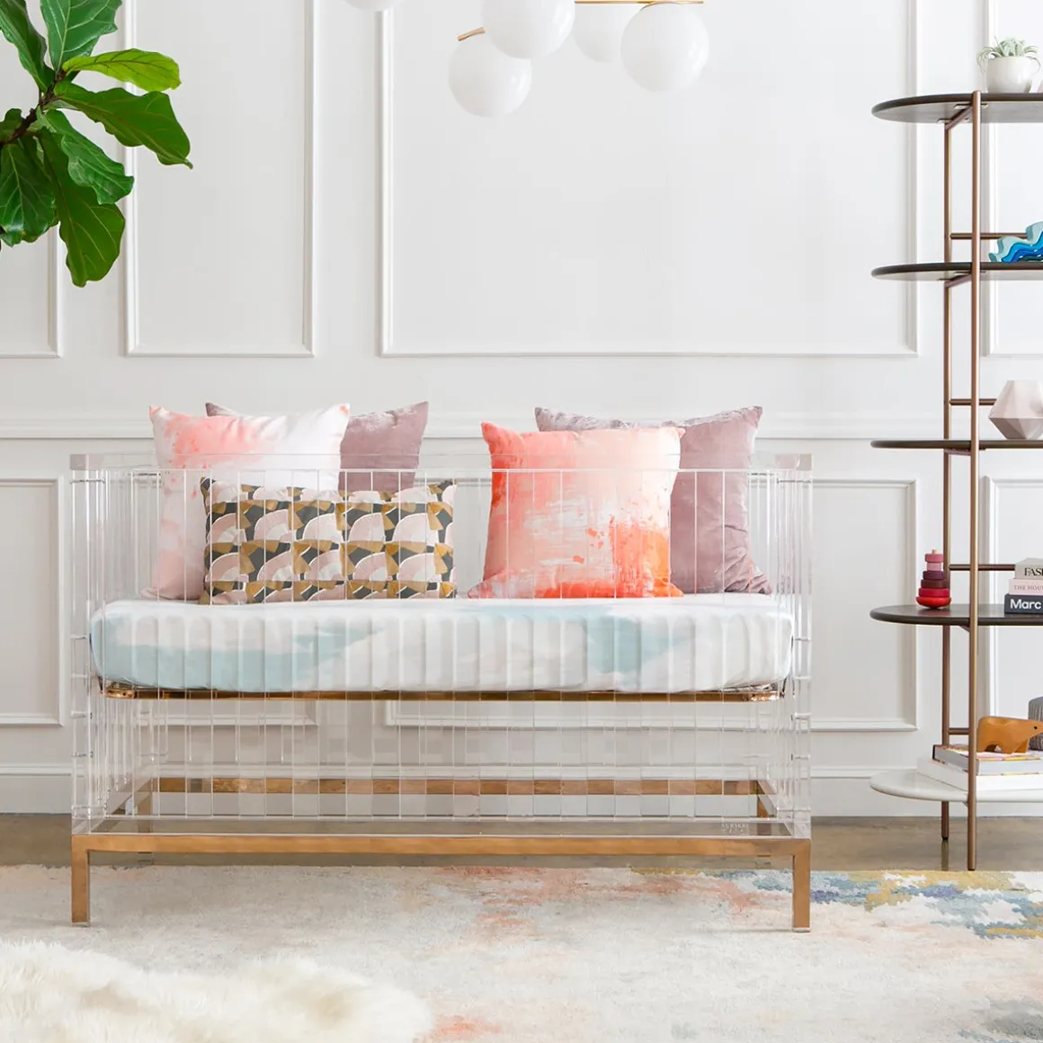 The Luma Crib seamlessly integrates form and function in the nursery space. The crib marries our signature acrylic aesthetic with an au courant rose gold touch. With four clear sides perforated by defined slats, the Luma creates an airy space for baby to play, relax and sleep, and allows you to have a clear view of baby from anywhere in the nursery.