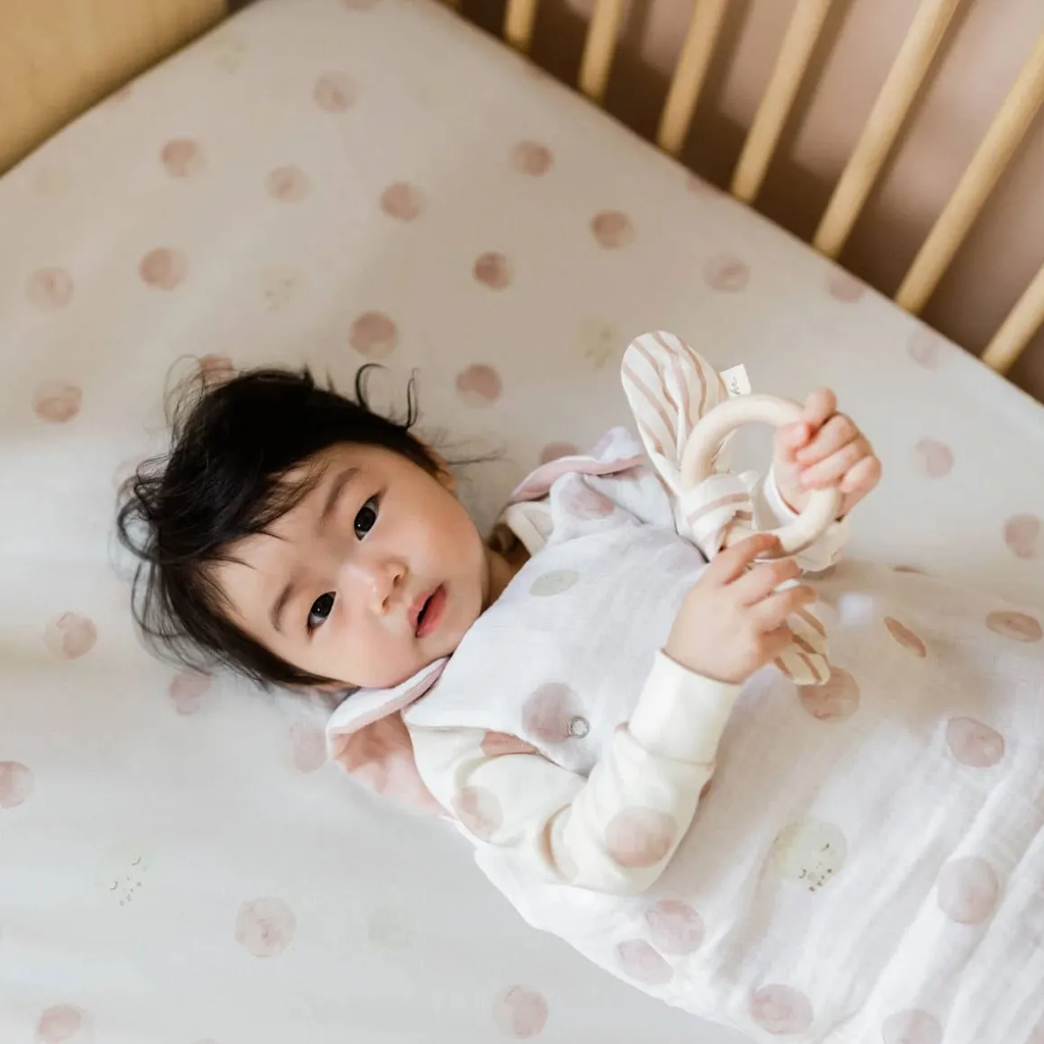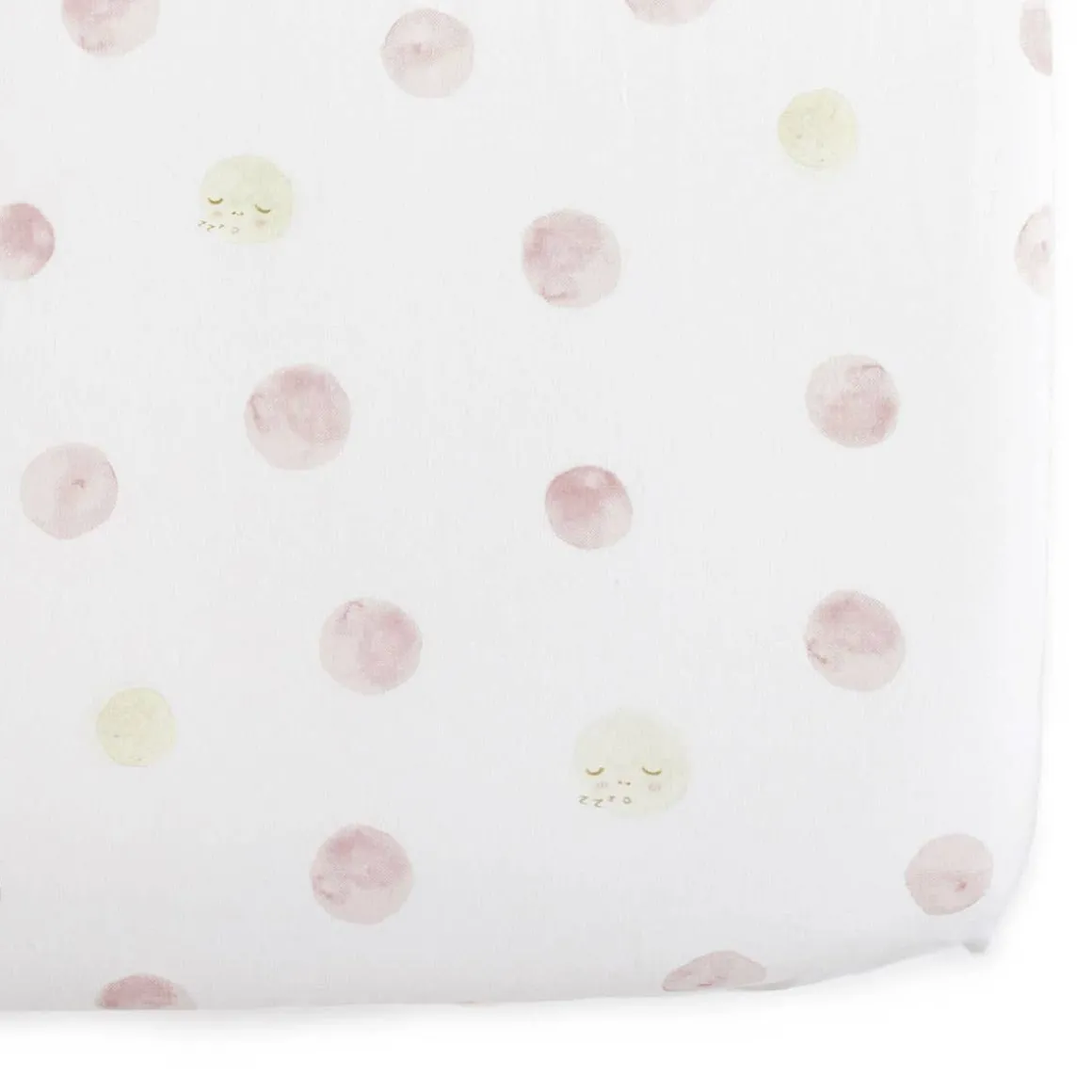 With sleepy eyes and tiny yawns, the gentle moon sets for the night. In a soothing watercolor palette amidst a sky of soft blues and pinks comes Luna. From dusk ‘til dawn, dreamland awaits under the care of Pehrs finest organic cotton Crib Sheets, Sleep Bags and Swaddles.