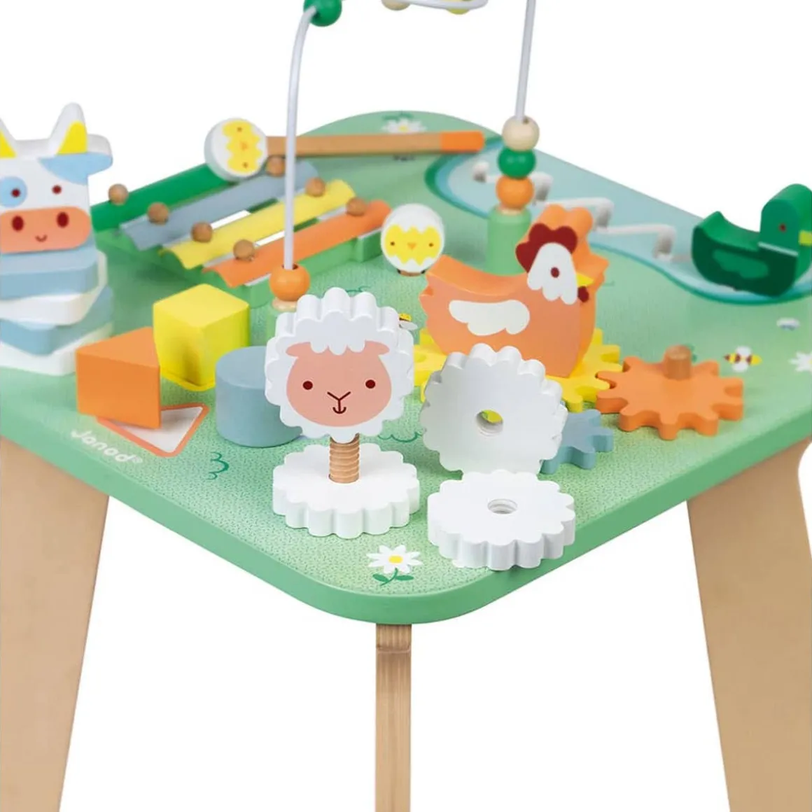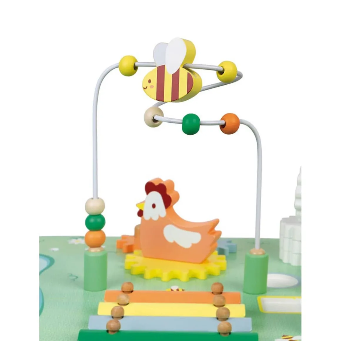 Head off to the countryside and its fields of pretty wildflowers with this multi-activity table, featuring all baby’s favourite farm animals! So let’s get going and help your child discover the 7 activities in this versatile activity table, including: 2 animals that can be stacked in 2 different ways to develop motor skills; a maze featuring a duck walking around their pond, designed to strengthen hand/eye coordination; a gear assembly baby can rotate to learn about cause and effect, 3 embedded cubes for learning about shapes; an abacus to develop concentration and a metal xylophone with 2 beaters to develop baby’s musical talents! This early-years table will take children aged 12 months and over from one discovery to the next in an environment they’ll adore! Table height: 32 cm. Water-based paint.