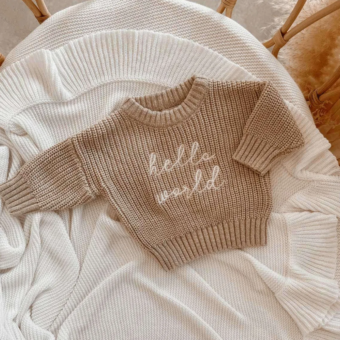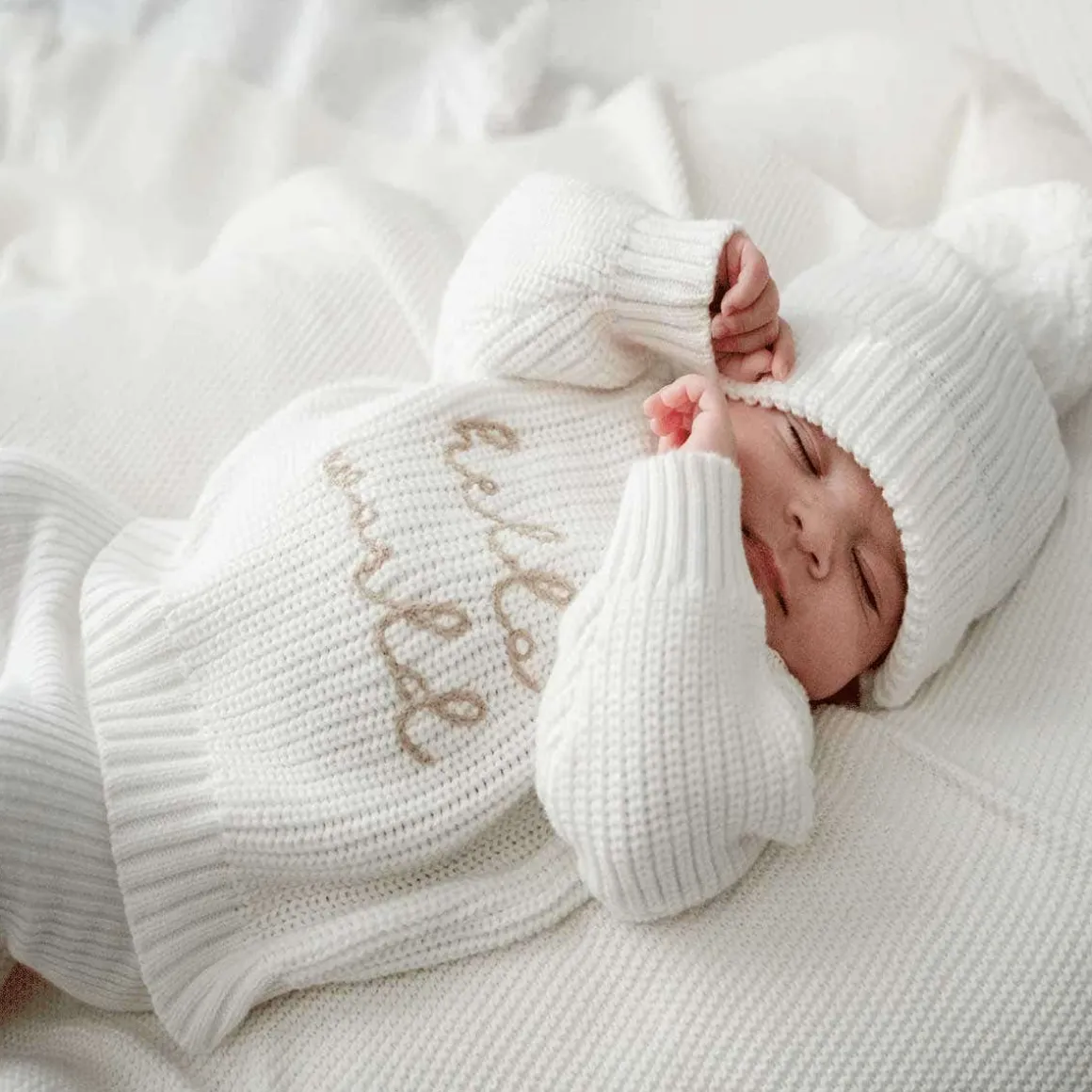 The beautiful cosy embroidered ‘Hello World’ Mini Knit Sweater is the perfect debut piece for your little love.