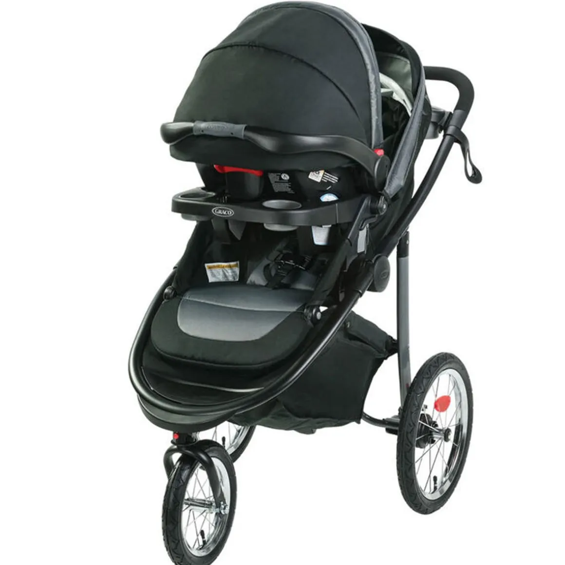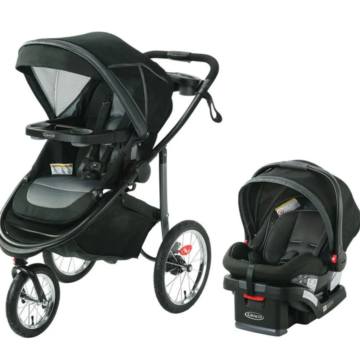 The Graco Modes Jogger 2.0 Travel System includes a jogging stroller and an infant car seat, giving you 7 ways to ride plus everything you need to jog, now with improved maneuverability for easy navigation. This jogging stroller has all the comfort and convenience features you need: air-filled rubber tires, a safety tether, a large UV 50 canopy, and ample storage. The one-hand, self-standing fold makes on-the-go adventures a breeze. Keep your child comfortable with the adjustable calf support, and keep them satisfied with the child’s tray with cup holders. The travel system includes the Graco SnugRide SnugLock 35 Infant Car Seat, which attaches to the stroller with a one-step, secure connection.